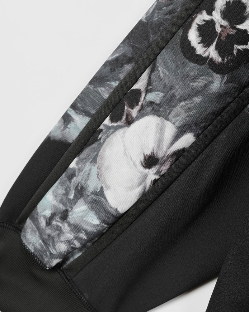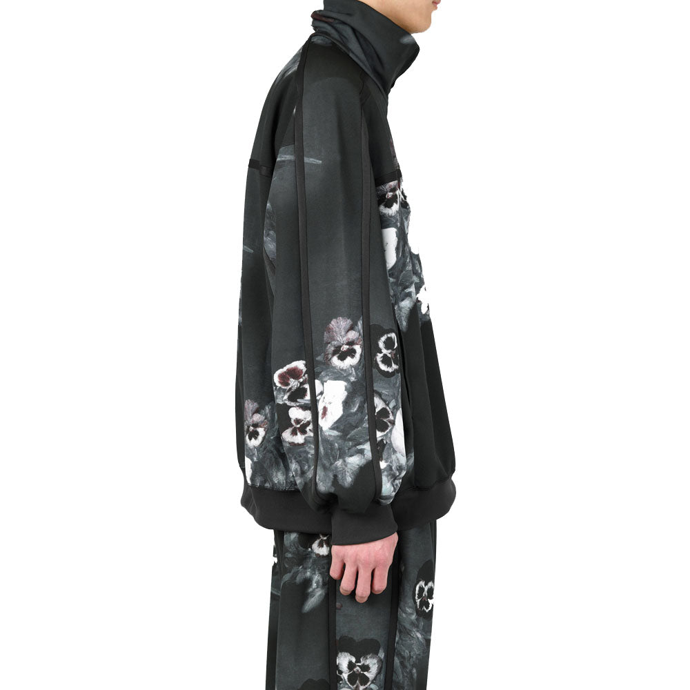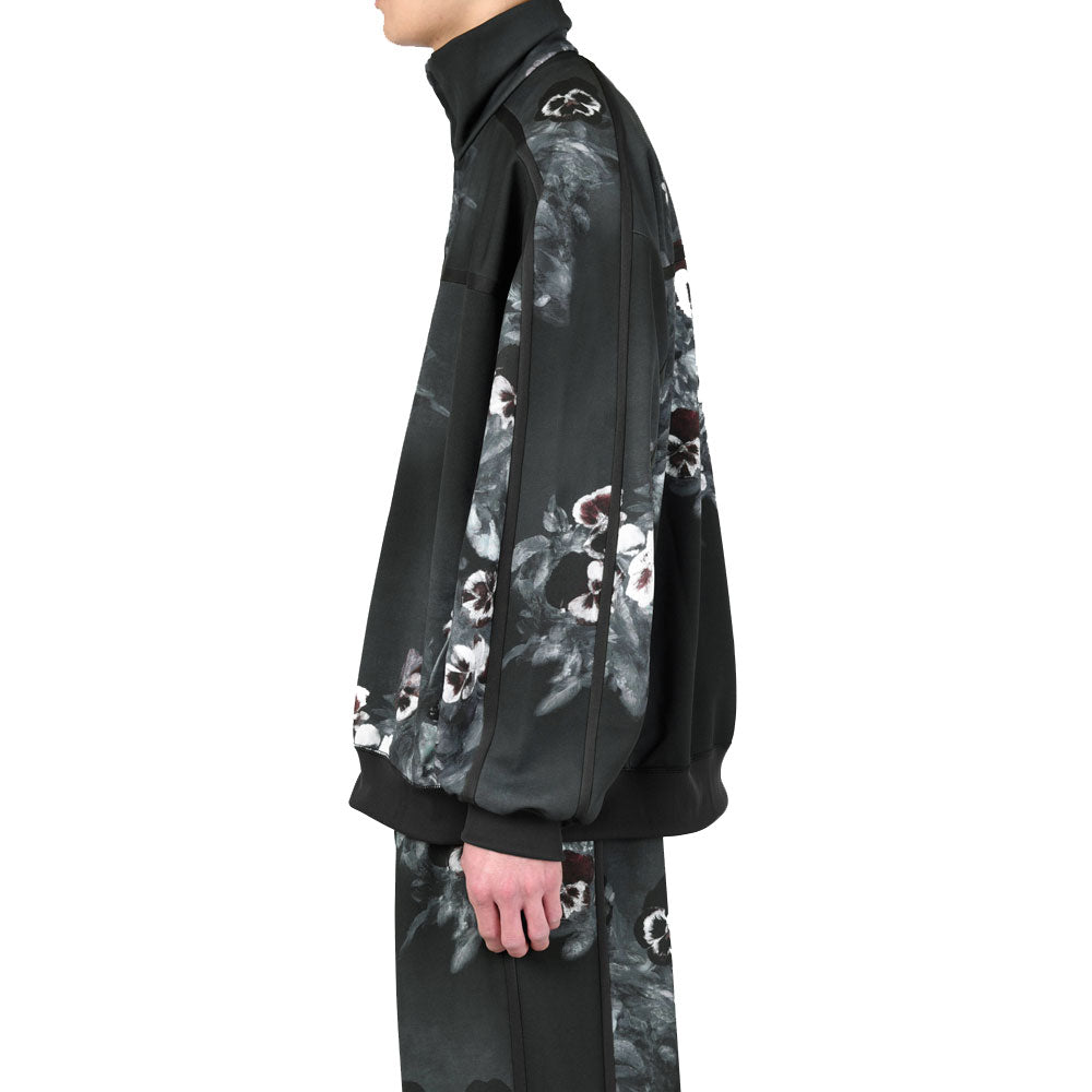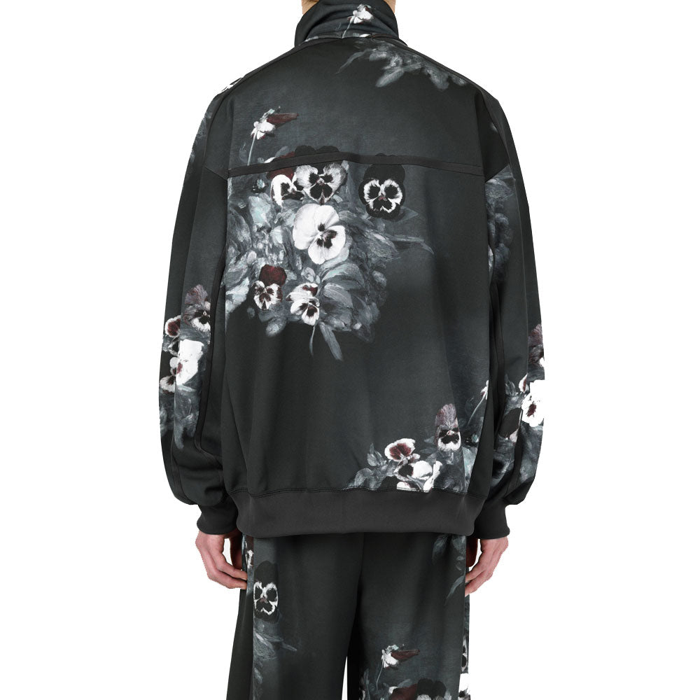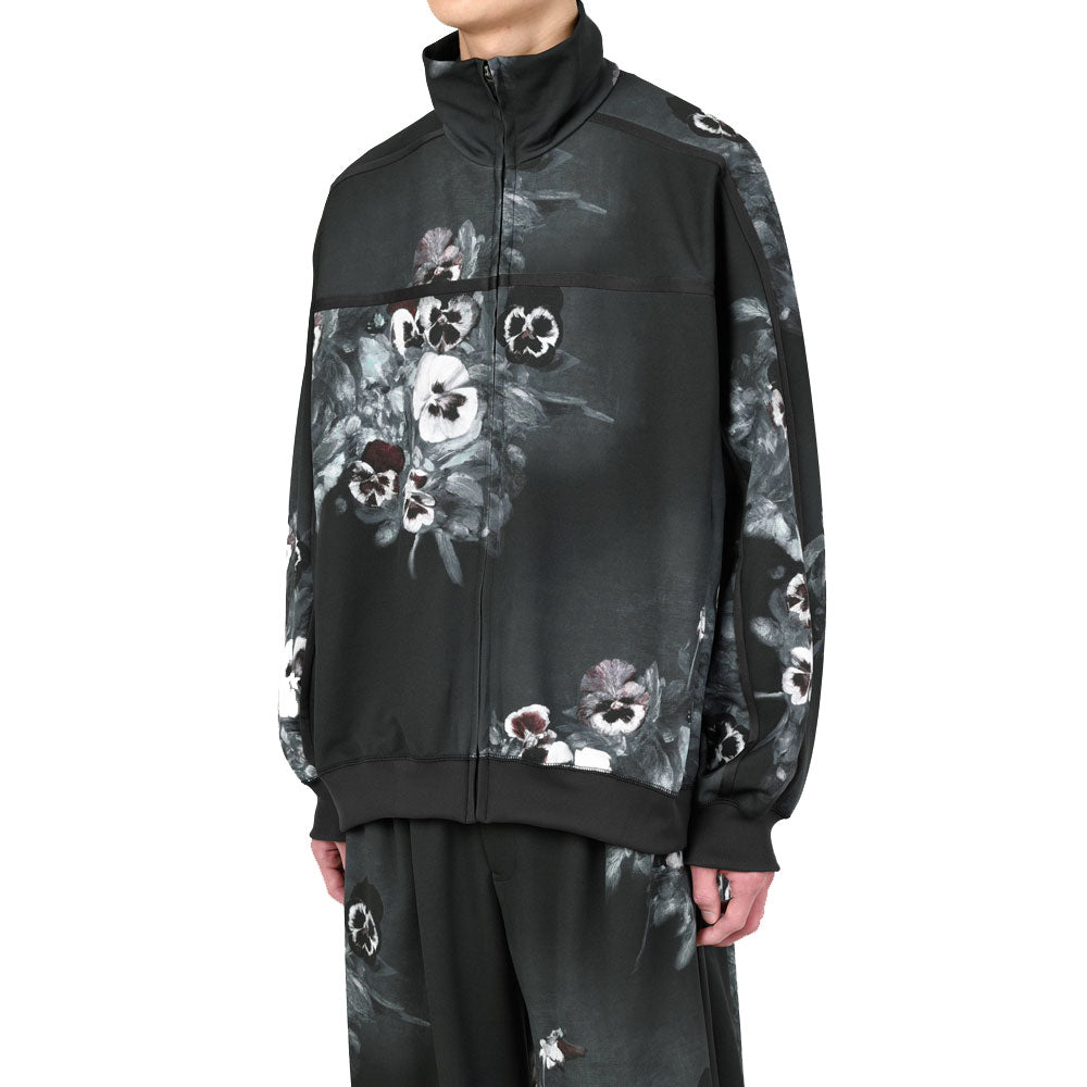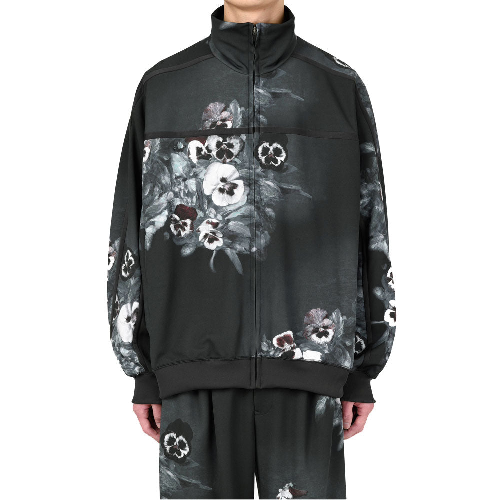 パンジー柄のエステルジャージ素材を使用したトラックジャケット。