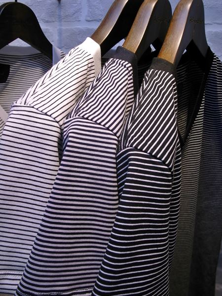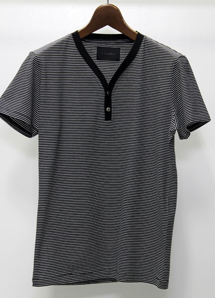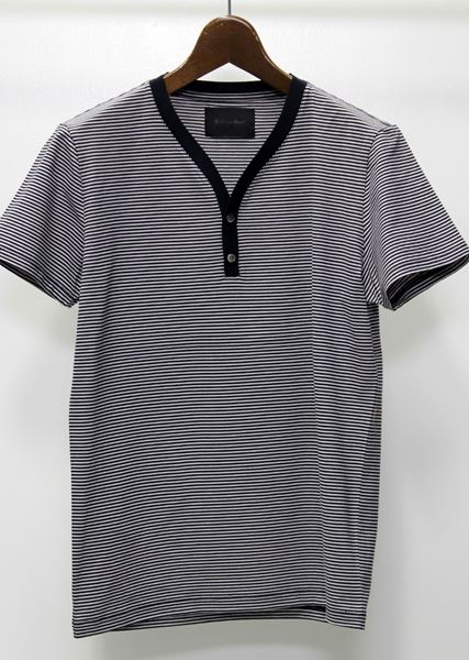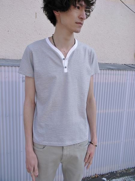 シンプルな細ボーダーのVヘンリーネックでございます。