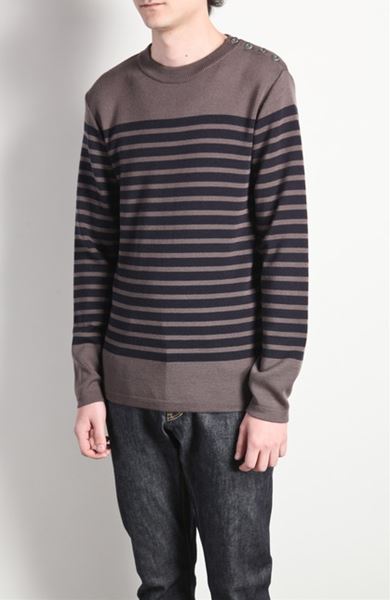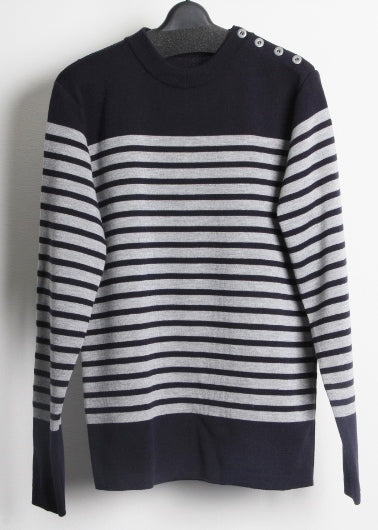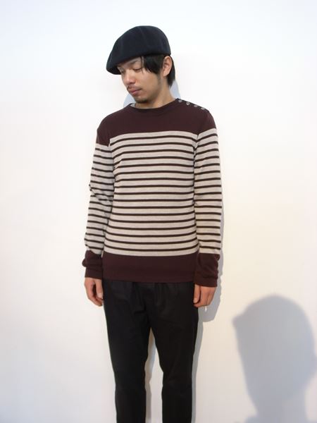 左肩にボタンを付けたボーダー切替ニットでございます。