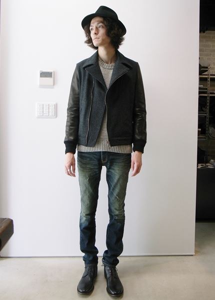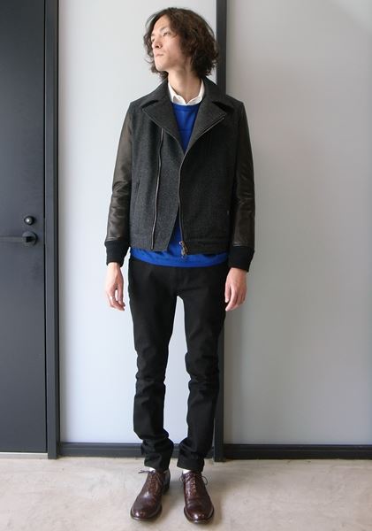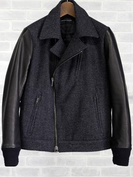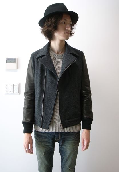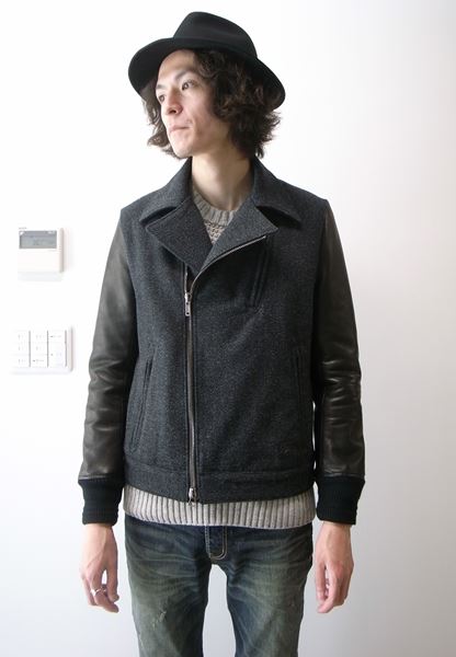 身頃は杢調のメルトン素材を使用し、袖は上質な馬革を使用したダブルのライダースでございます。