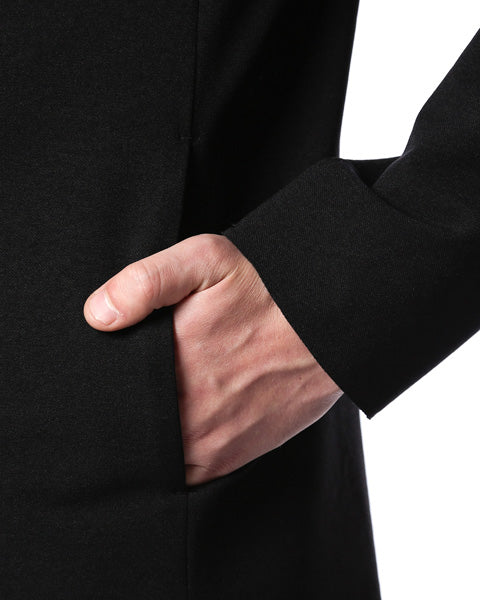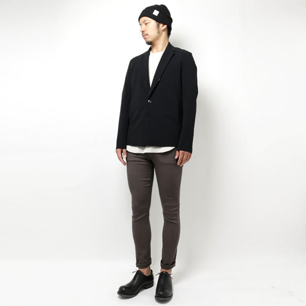 1ホックと2ボタン仕様の定番細身ジャケットの形で軽さがありストレッチ入りで動きやすいのが特徴。