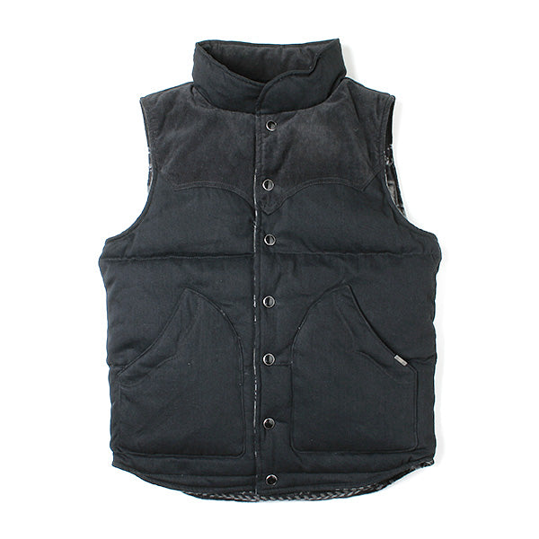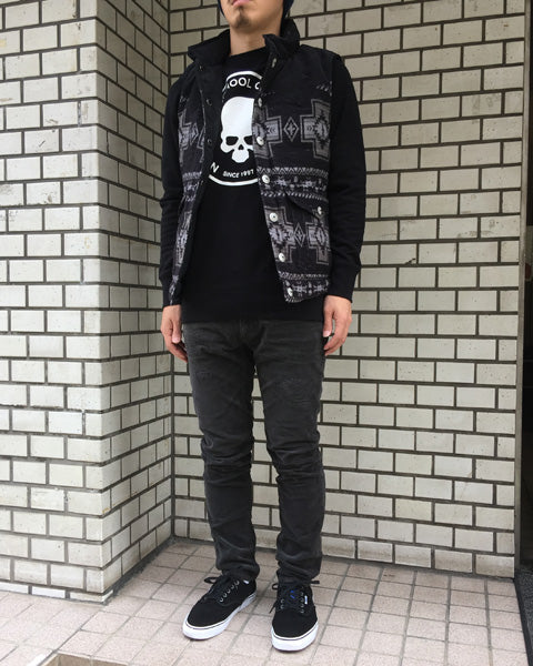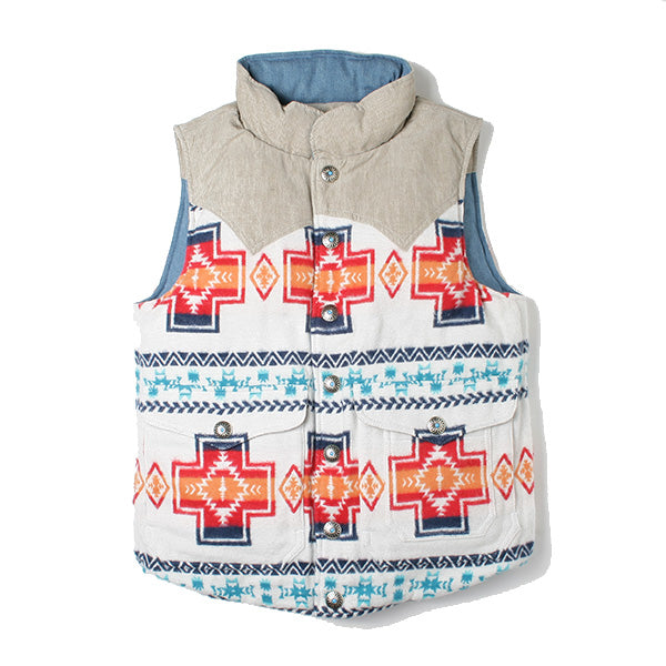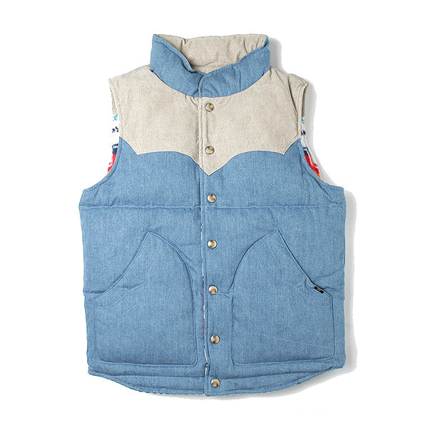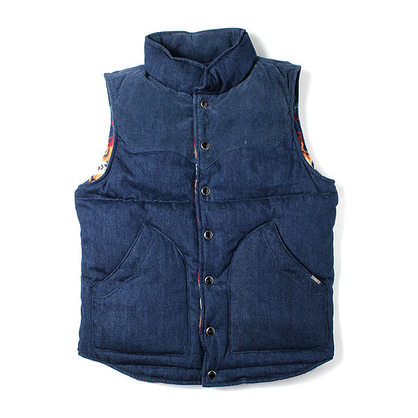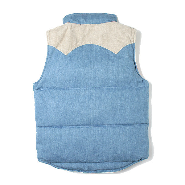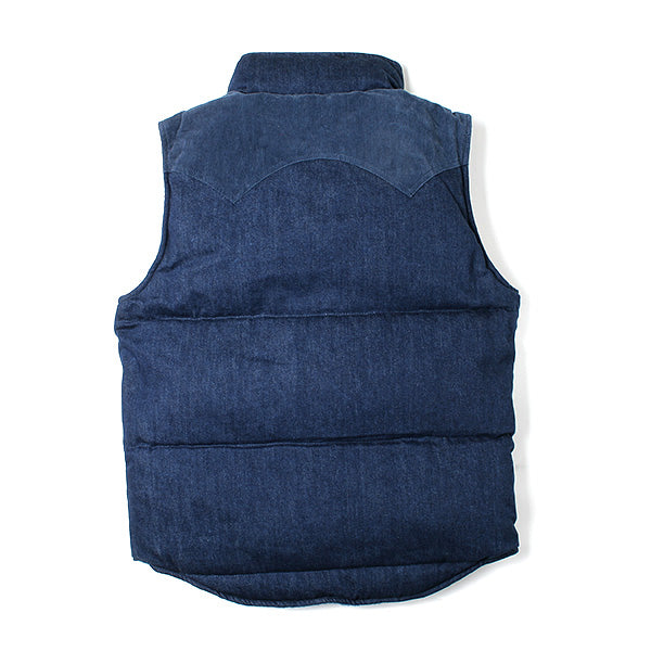 デニムを生地の状態で加工を施したデニムダウンベストです。