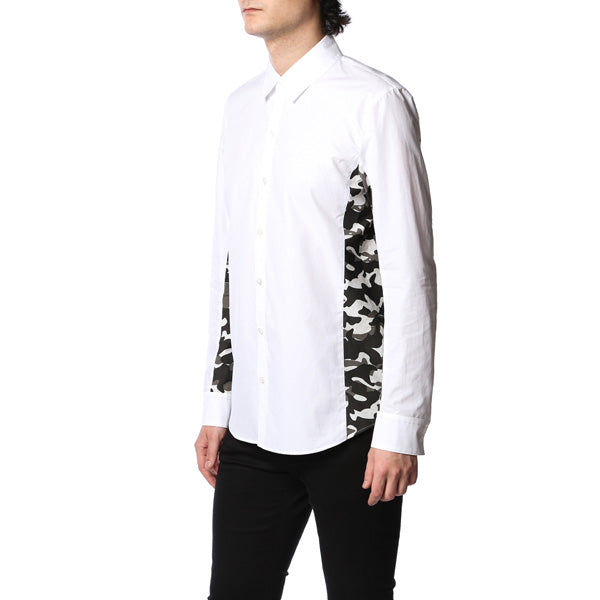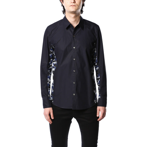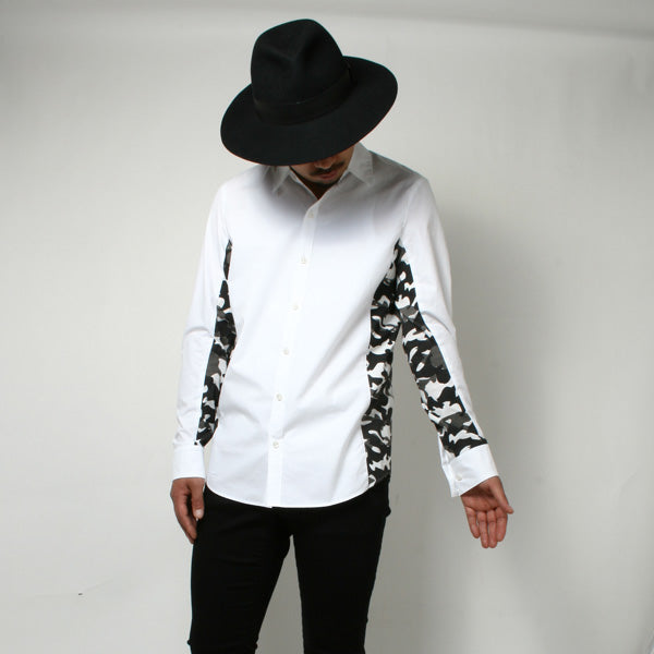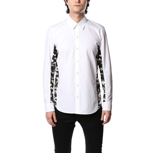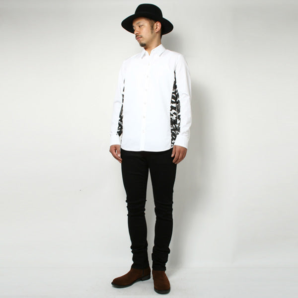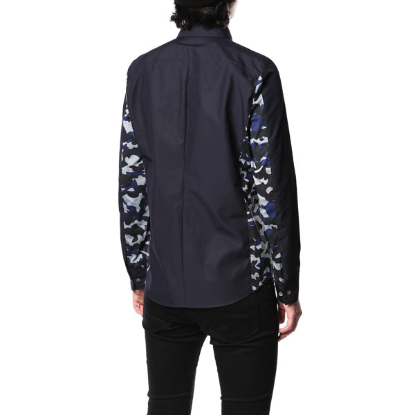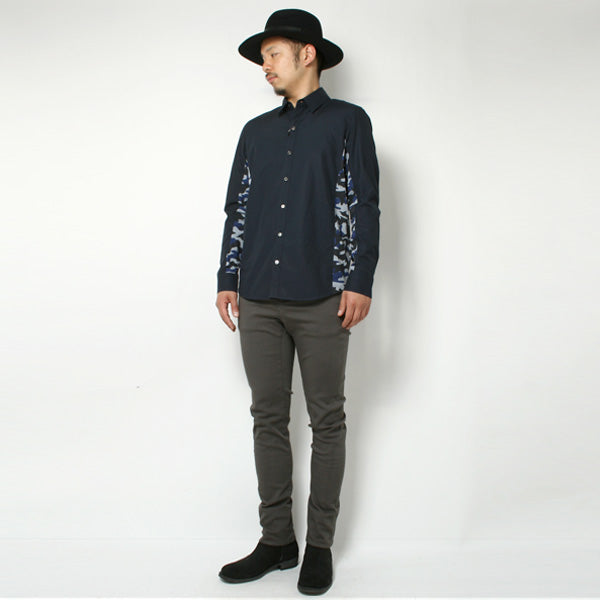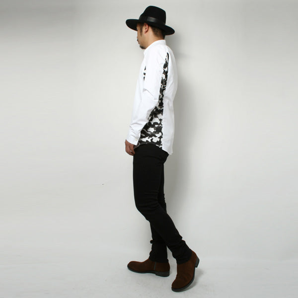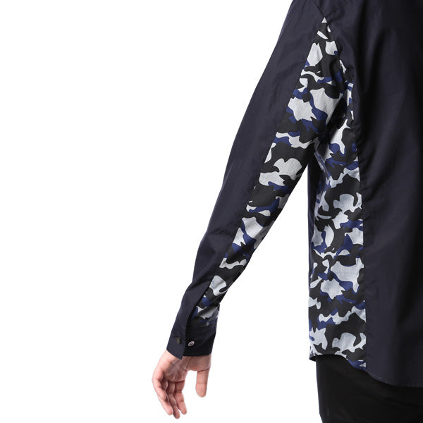 袖内側と身頃の両脇をカモ柄素材に切り替えております。