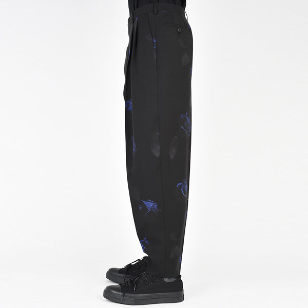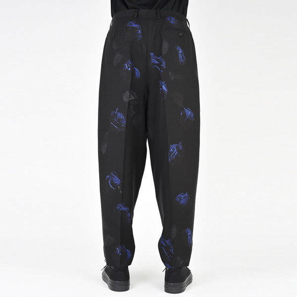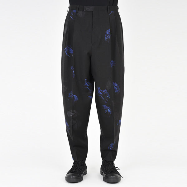 ローズ柄をプリントしたウール素材を使用した2タックテーパードワイドスラックス。