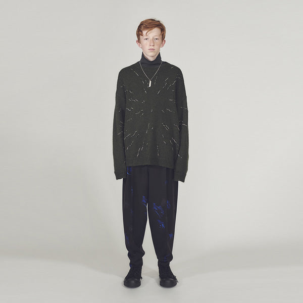 タックで立体的なボリュームのある膝上から裾にかけて鋭くテーパードしています。