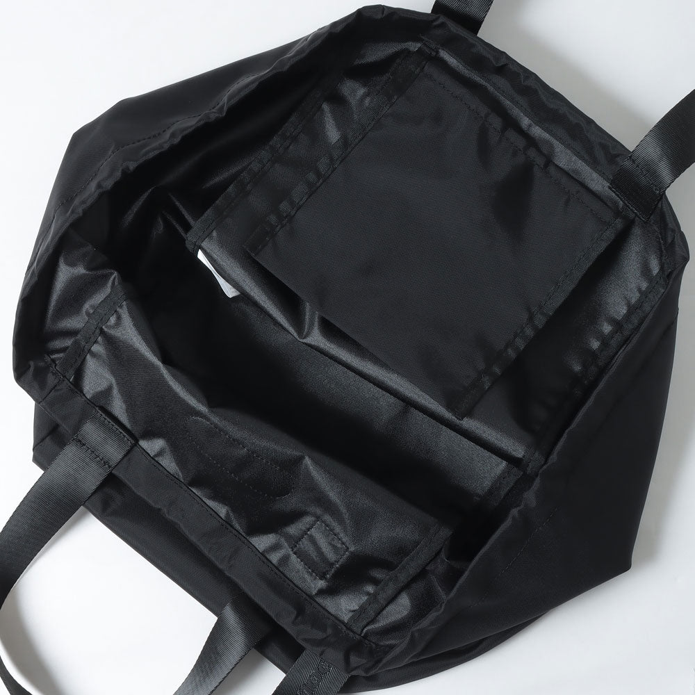 ・ショルダーバッグとして使える2WAY仕様。内側に小物の収納に便利な吊りポケット付き。背面に両ブランドのロゴの織りネームを配置。容量45L。