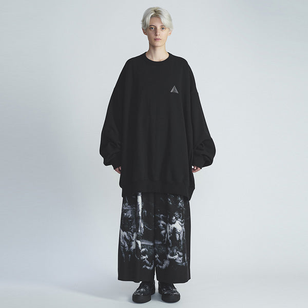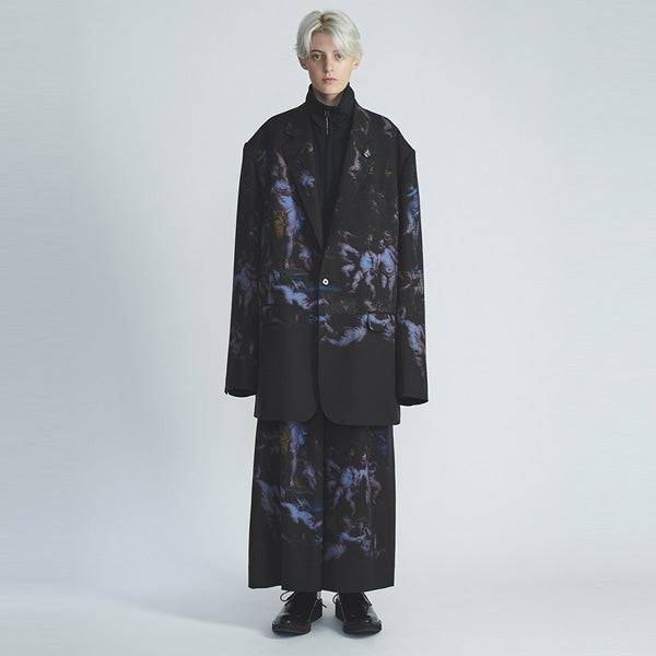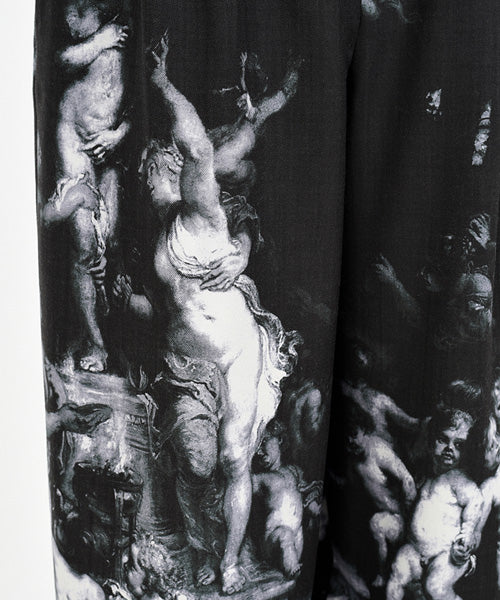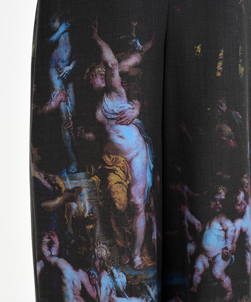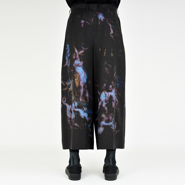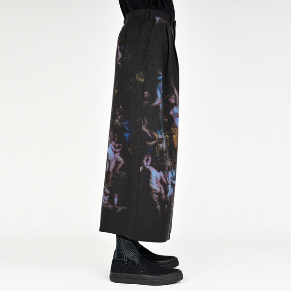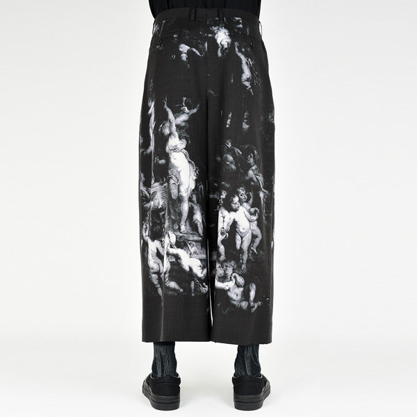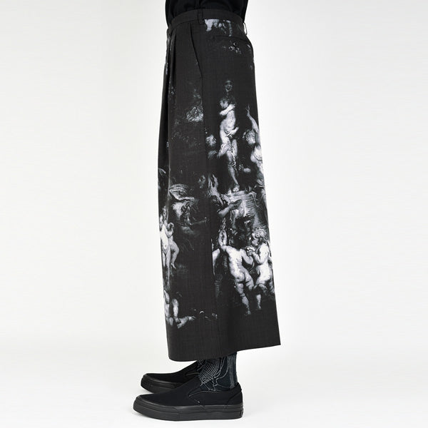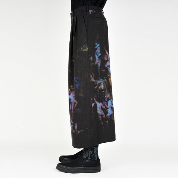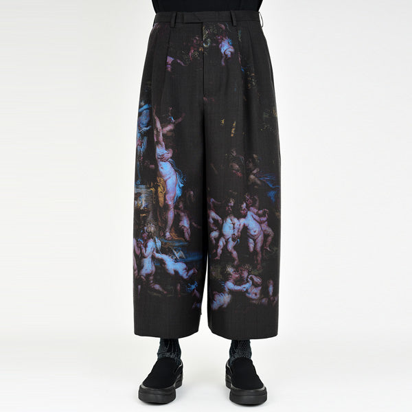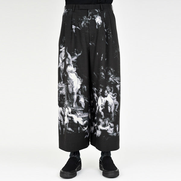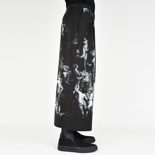 天使柄をプリントしたウール素材を使用したクロップド丈の2タックワイドスラックス。