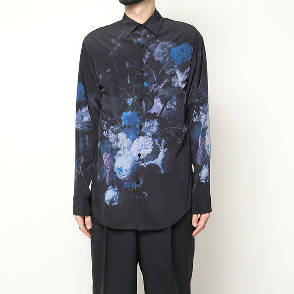 フラワー柄をプリントしたデシン素材を使用したレギュラーカラーシャツ。