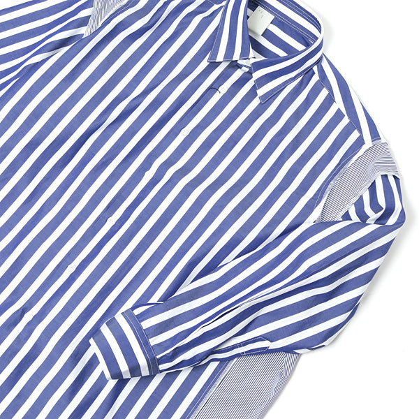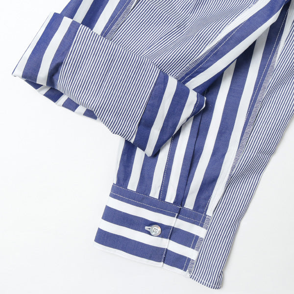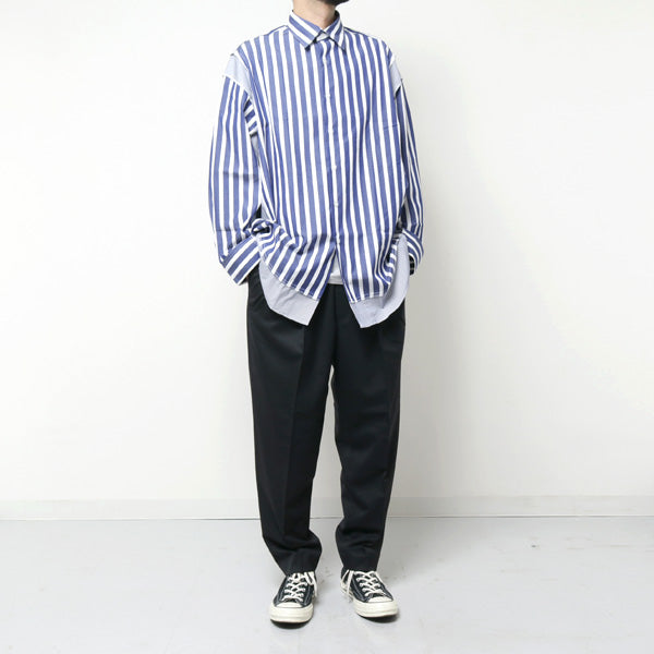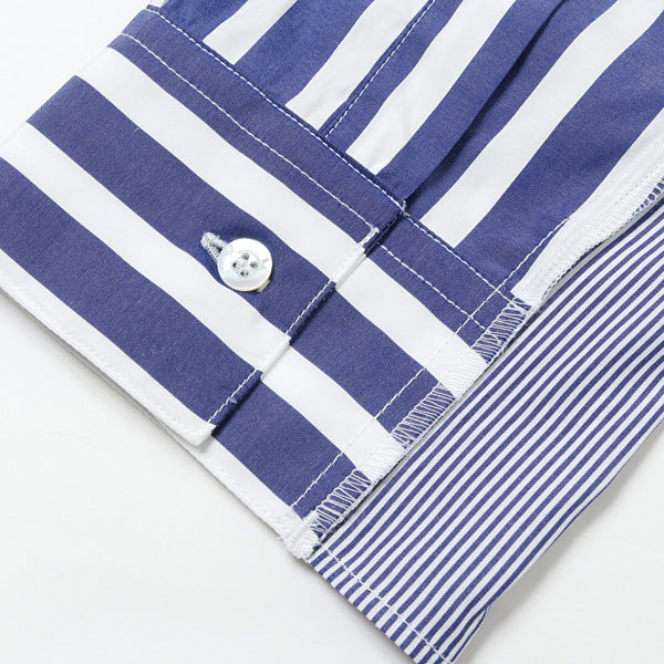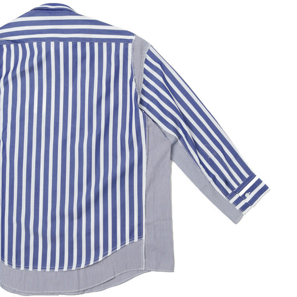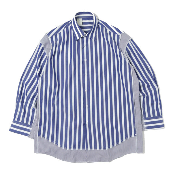 スタンダードなシャツの袖、脇、裾に別生地を“足し算”することで再構築した、ビッグシルエットシャツ。しなやかで控えめな光沢を持つ生地の特徴と、美しい配色が相まって様々な表情を演出。インパクトがありながら馴染みのよいデザインは、幅広いスタイリングでお楽しみいただける逸品。