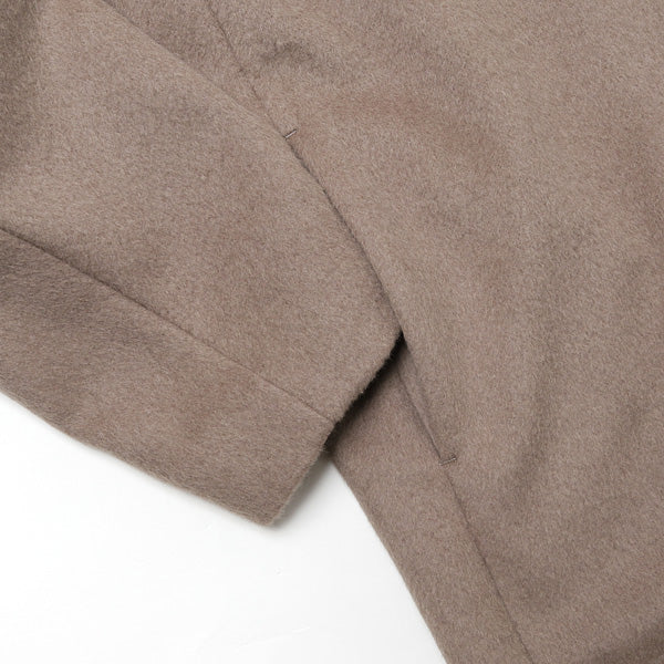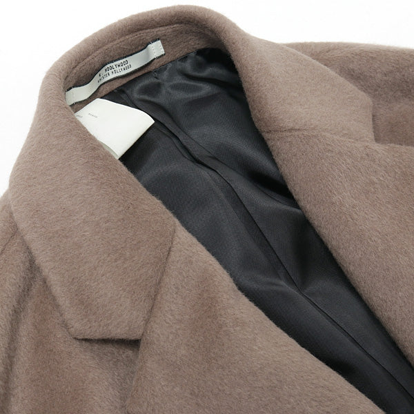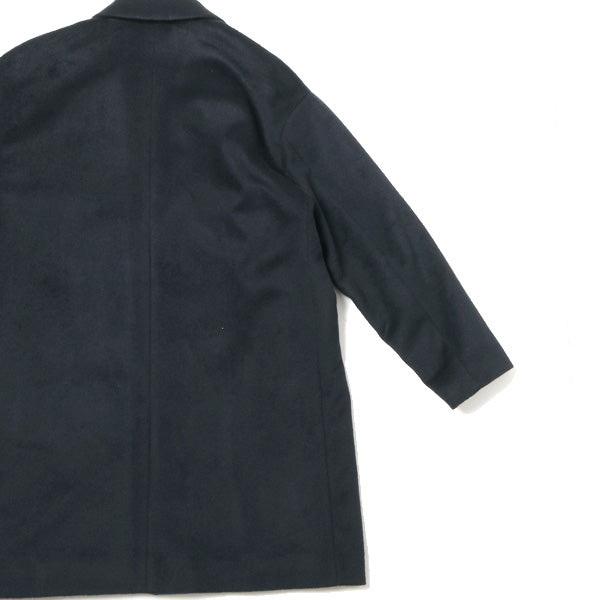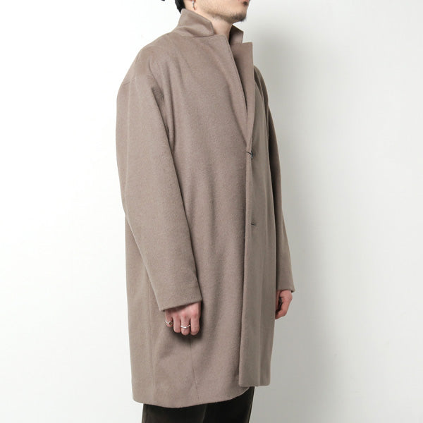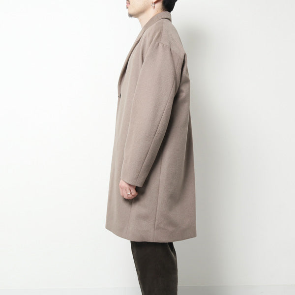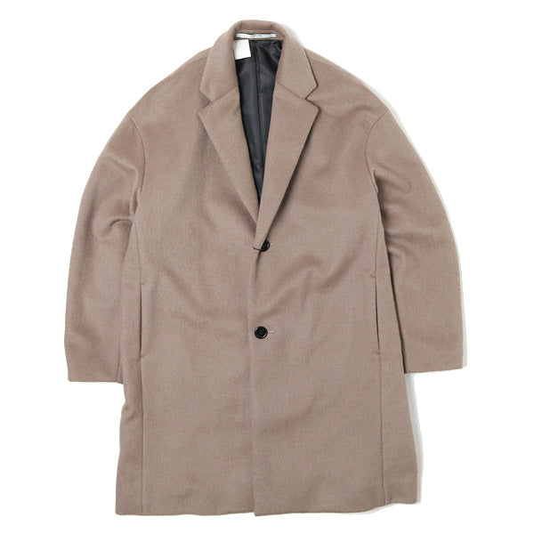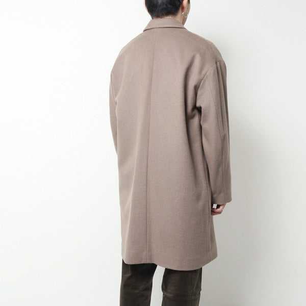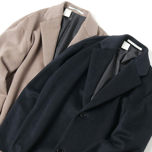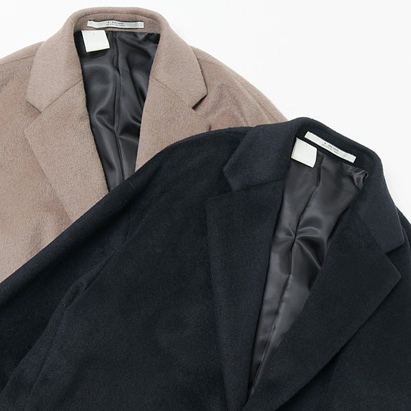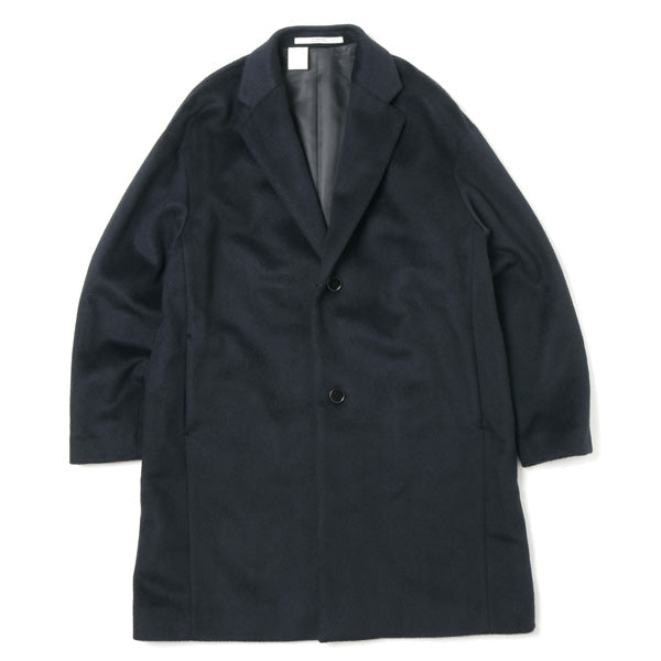 リラックスしたサイズ感とどんな着こなしにも合う膝上丈が人気を博し、数シーズンにわたり展開しているドロップショルダーのチェスターコート。今シーズンは上品な艶と柔らかな表情のアンゴラウールを使用し、柔軟な繊維の太い毛が高い保温性を発揮。首元をすっきり見せるやや深めの位置につけた二つボタン、ノーベントのバックシルエットなど、ソリッドに仕上げた逸品。オフィスカジュアルからプライベートシーンまで汎用性の高さも魅力。