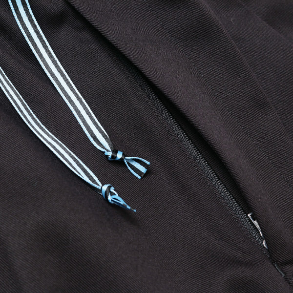 ・スラッシュポケット、ヒップは左側に両玉縁ポケット。ウエストに内蔵されたゴムとドローコードで、細かなサイズ調整が可能。