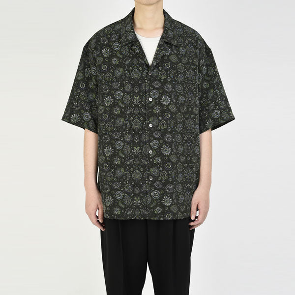 ペイズリー柄をプリントしたデシン素材を使用したオープンカラービッグシャツ。