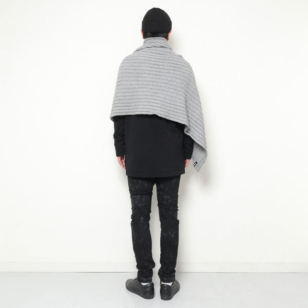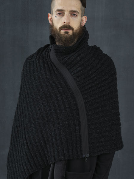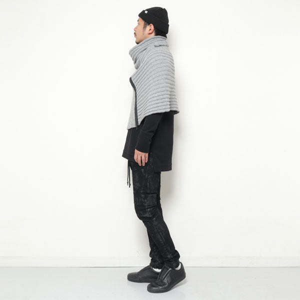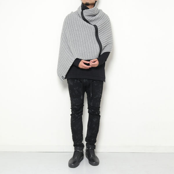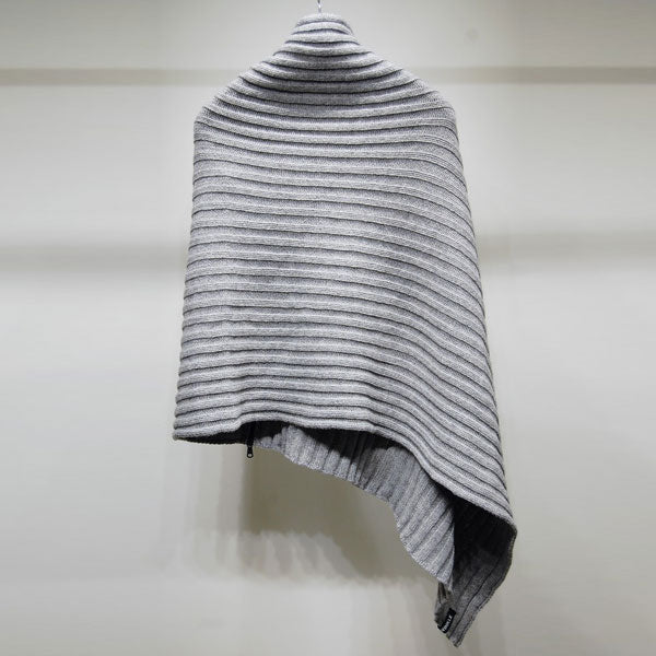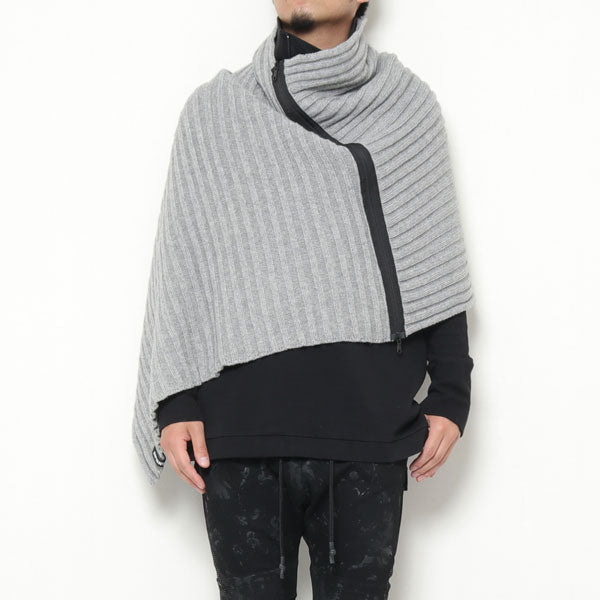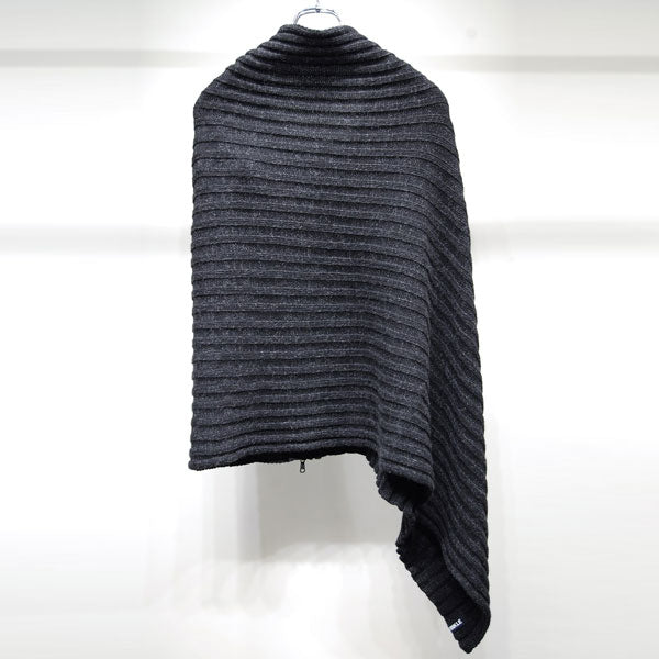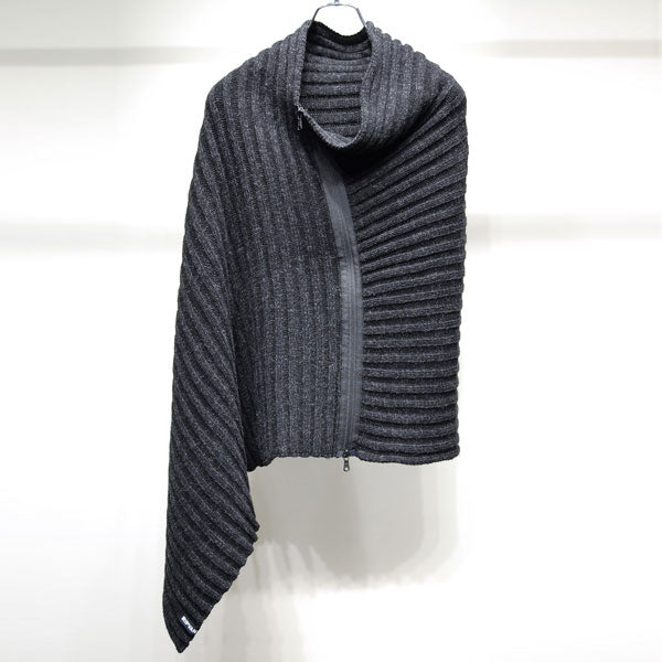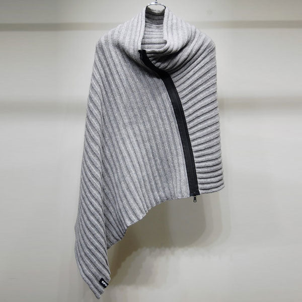 通常のウール混糸と比較してソフトで軽く膨らみ感のある 特殊紡績軽量ウールを使用した3GGx2リブ編みのZIPポンチョです。 アシンメトリーなデザインもポイントの一つとなっております。