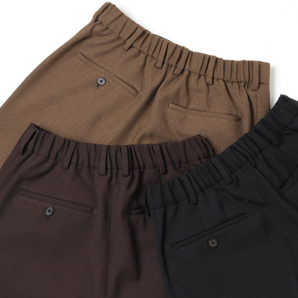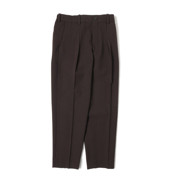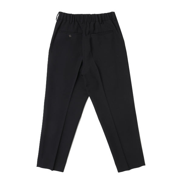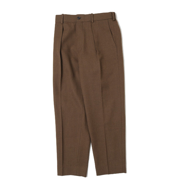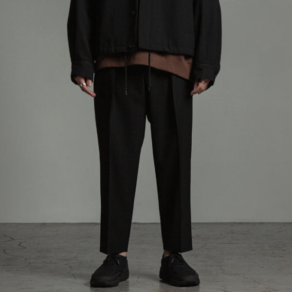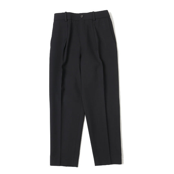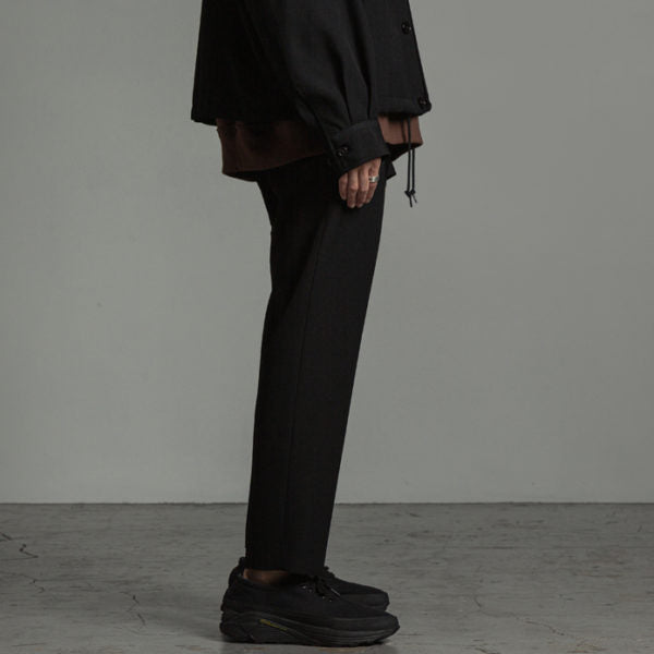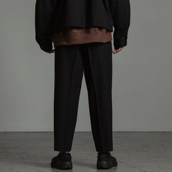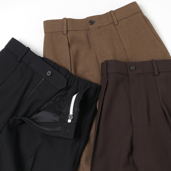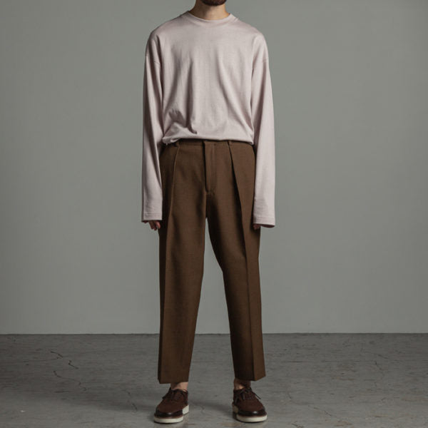 ブランド定番の「ペグトップトラウザーズ 」。深いタックによるゆとりある腰回りから裾に向かって綺麗にテーパードするシルエットはトップスを選ばないボトムスです。