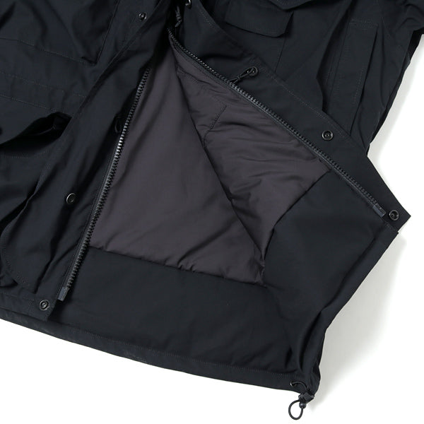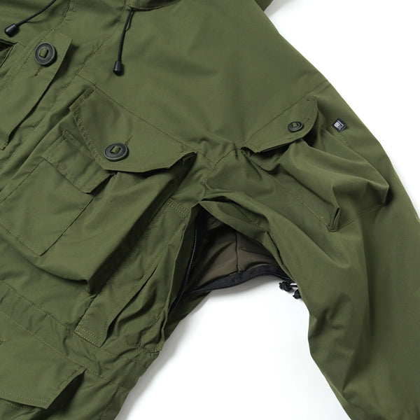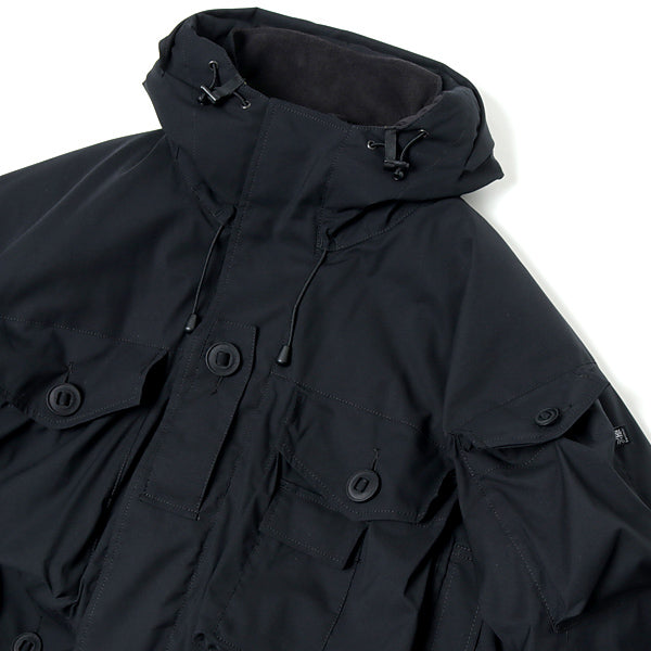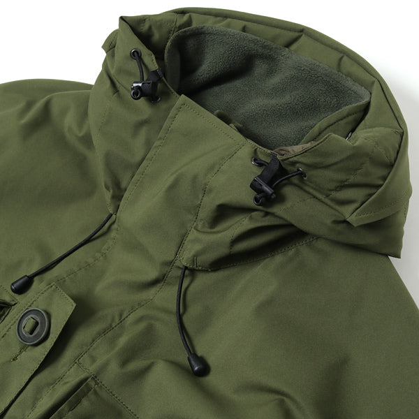 ・マチ付きの大容量ポケットの他、サイドにはフリースを内蔵したハンドウォーマーポケット付き。フロントには寒気を完全にシャットダウンするスナップボタンとファスナーのダブル仕様。またファスナー内側にもポケットを完備。その他、ポケットのフラップにもベルクロ付き隠しポケットなどオリジナルのディテールを踏襲。収納可能なフードは、アジャスターを配することで防寒力と安定感を確保。サイドにはベンチレーション、ウエストや裾にはスピンドル付き。