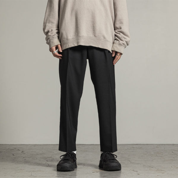 ウエストバックにゴム入り仕様の程好いテーパードシルエットのタックパンツ。
