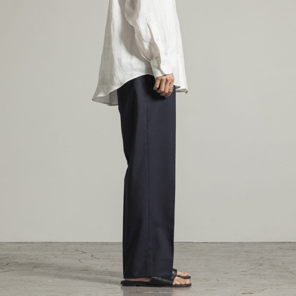 ノータックで程よいゆとり感の腰回りから、裾に向かってストンと落ちるシルエットが上品なトラウザース。