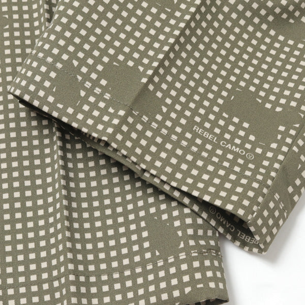 ・UNDERCOVER のアーカイブから提供を受けたナイトカモフラージュを使用し、今回のために命名された“REBEL CAMO” をプリント。 “REBEL FABRIC” のタグは、UNDERCOVER デザイナー高橋 盾氏がN.HOOLYWOOD のために特別にデザイン。コットンポリエステルのツイル地を使用。プリント後に洗い加工を加えることで、当時の柔らかさを再現。