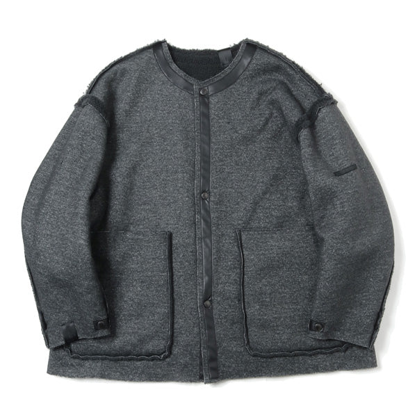 ・随所にレザーのテープを配したカットオフ仕様。フロント、袖口にはロゴを刻印したオリジナルドットボタンを使用。スロテッドポケット付き。ドロップショルダーにゆったりとした袖幅。立体的なパターンメイクを用いて袖先へシェイプすることで柔らかいボリュームを演出。左袖にはN.HOOLYWOOD COMPILE のネームを配置。