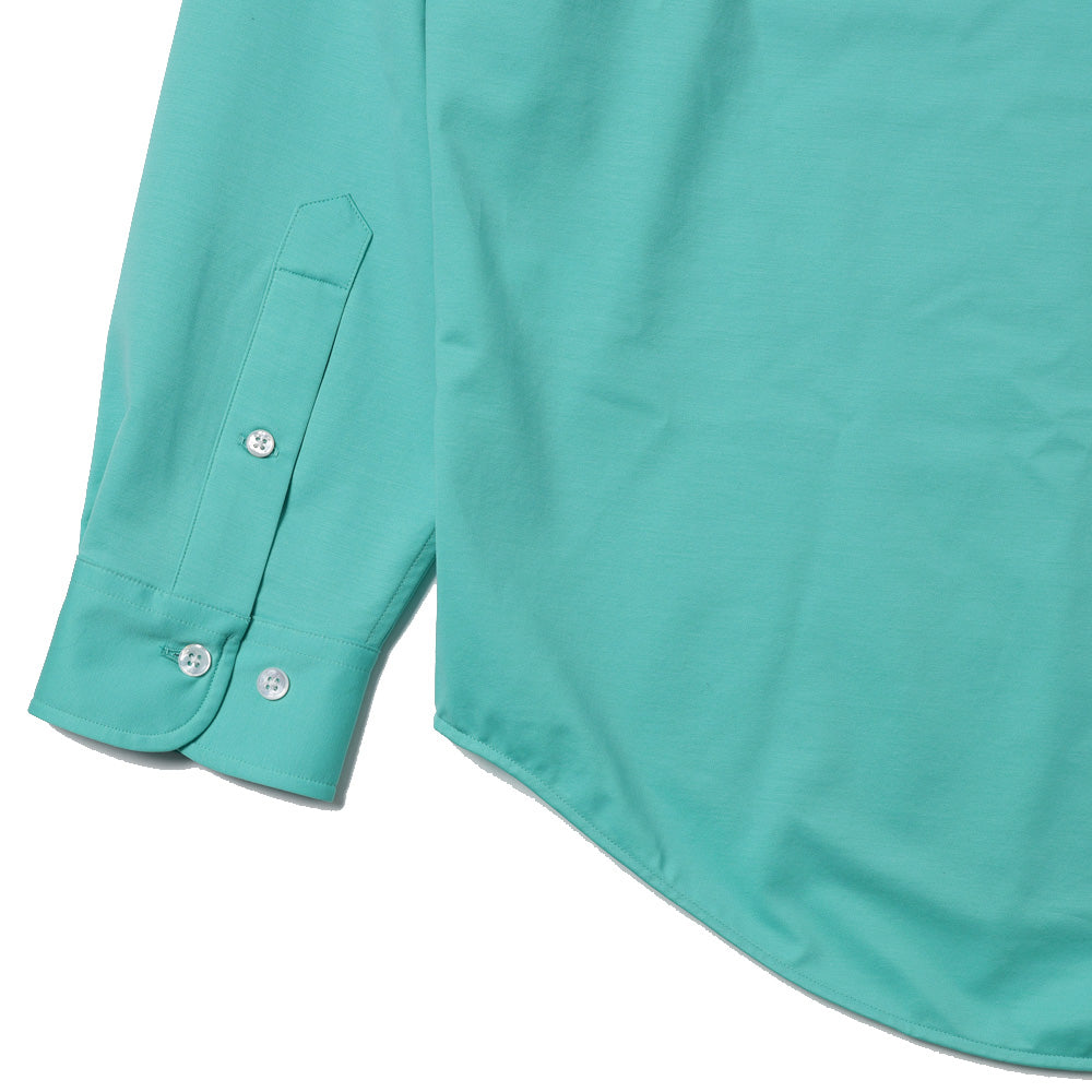atmosphere 空気を纏うという名前の通り、 ゆったりとしたシルエット、素材の落ち感がわかりやすい定番ルーズシルエットのシャツです。ディティールは、ドレスシャツを採用し全て巻き伏せ本縫い仕様、貝蝶釦使いです。素材のハリ感、光沢感がある為、オーバーパターンですがカジュアルになりすぎない、生地が生み出すドレッシー感とパターンが生み出すカジュアル感を融合させた、ラグジュアリールーズな唯一無二のシャツ。綿糸の原料は、120/1 という細番手リサイクルスビンコットンを双糸使い。糸もガス焼きしたものを使うことで、より光沢感と洗濯後の毛羽を抑えております。50D高捲縮リサイクルナイロンを使用し、ストレッチ性を出しております。今シーズンから釦裏側にブランドロゴを入れております。