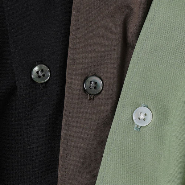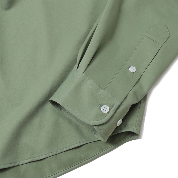 atmosphere 空気を纏うという名前の通り、 ゆったりとしたシルエット、素材の落ち感がわかりやすい定番ルーズシルエットのシャツです。ディティールは、ドレスシャツを採用し全て巻き伏せ本縫い仕様、貝蝶釦使いです。素材のハリ感、光沢感がある為、オーバーパターンですがカジュアルになりすぎない、生地が生み出すドレッシー感とパターンが生み出すカジュアル感を融合させた、ラグジュアリールーズな唯一無二のシャツ。綿糸の原料は、120/1 という細番手リサイクルスビンコットンを双糸使い。糸もガス焼きしたものを使うことで、より光沢感と洗濯後の毛羽を抑えております。50D高捲縮リサイクルナイロンを使用し、ストレッチ性を出しております。今シーズンから釦裏側にブランドロゴを入れております。