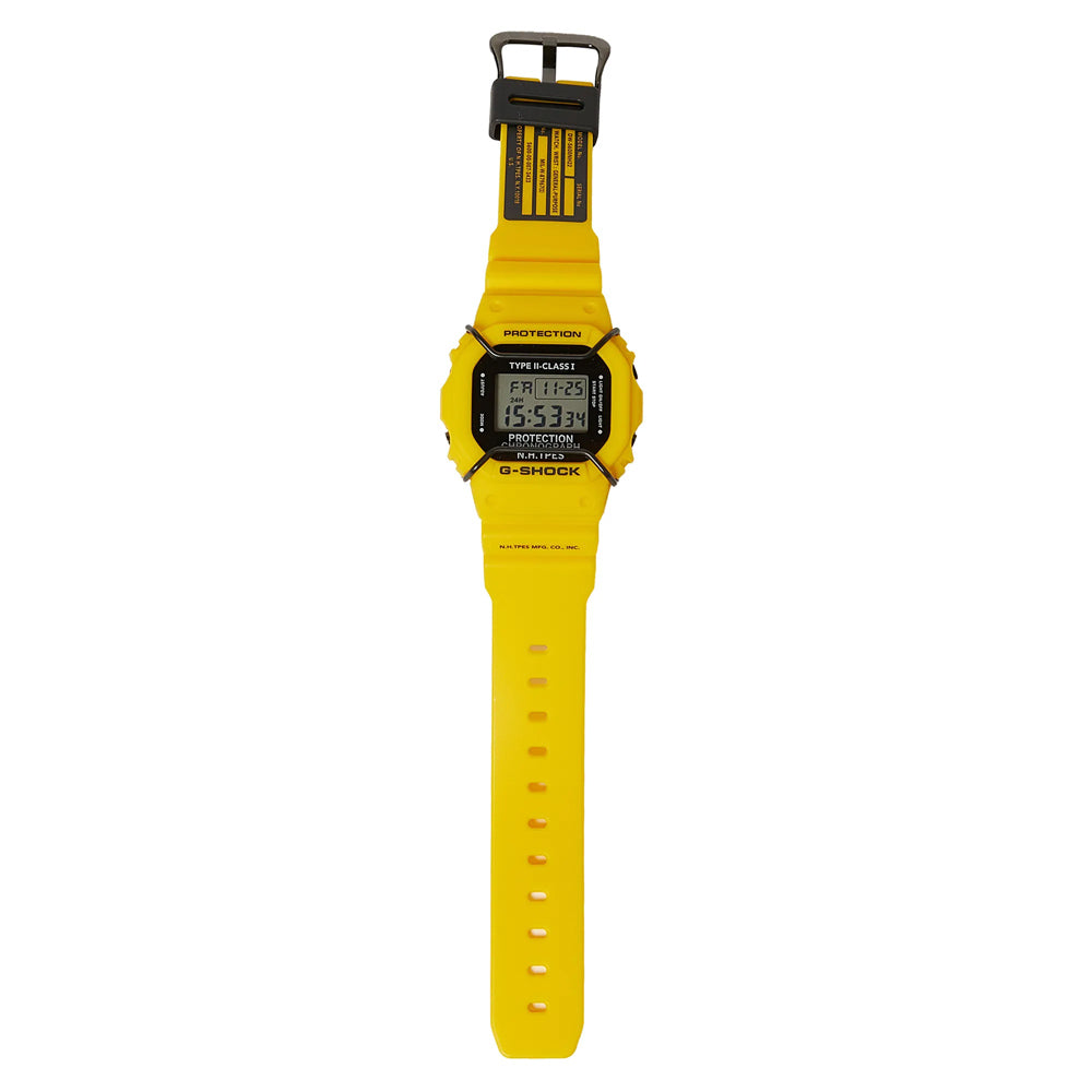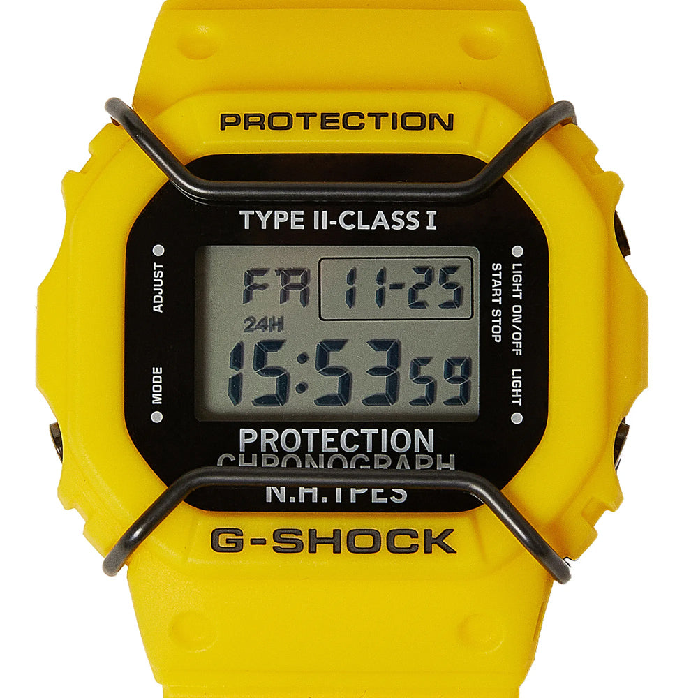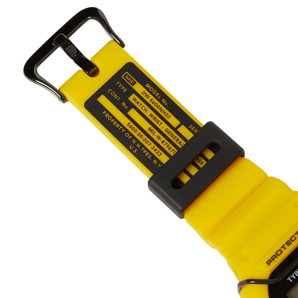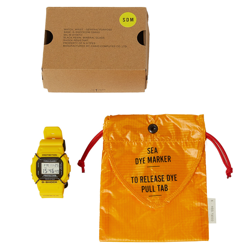 ・当時の”DW-5600”には付いていなかったプロテクターを装備し、よりタフな仕様に。マットなイエローとブラックのコントラストが美しい一本。フェイス上下、ベルト、ケース裏にはN.H.TPES のミルスペックを刻印。米軍の官給品を彷彿とさせる、オリジナルのパッケージを製作。また今季のデザインインスピレーションとなった米軍のSEA DYE MARKER をイメージしたポーチ付き。幅広いサイズ調節が可能なユニセックス仕様。