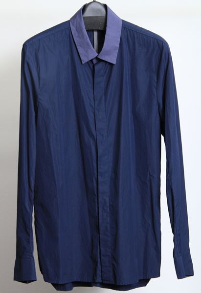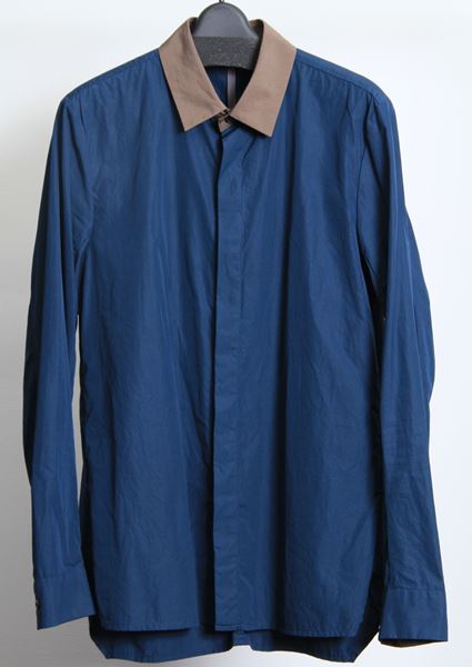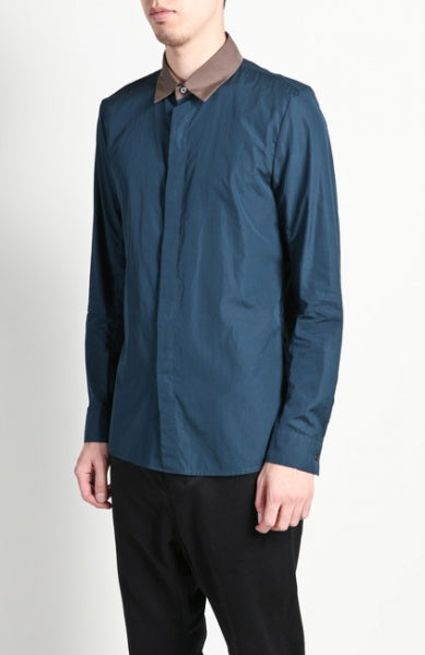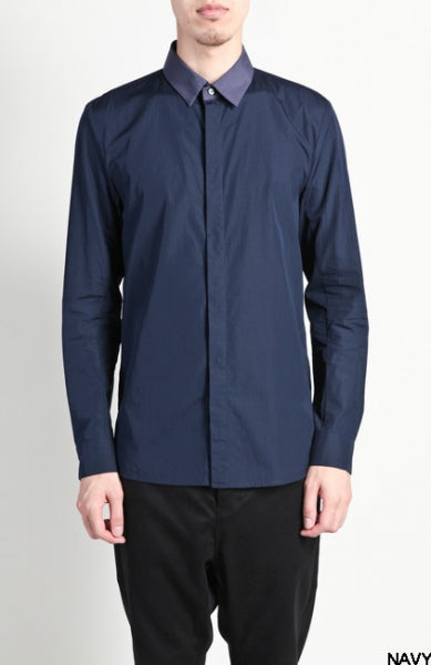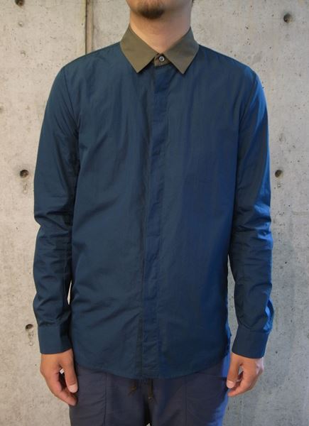 襟とカフスの裏地を配色仕様にした比翼タイプのシャツでございます。