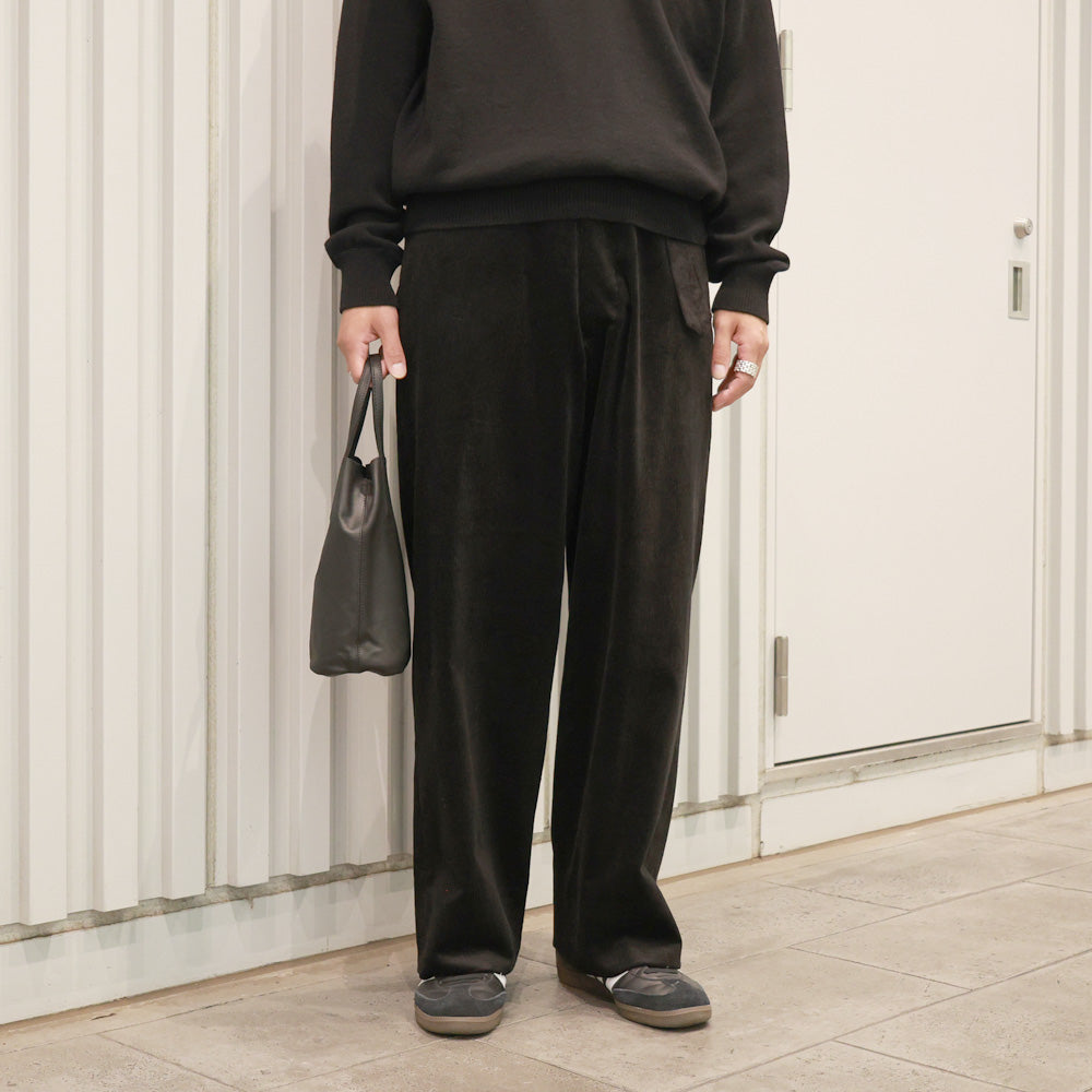 フレンチモーターサイクルパンツからインスピレーションを得たベルテッドトラウザーズ。たっぷりとしたワイドシルエットが特徴です。ヴィンテージにならったバックル付きのベルトの他、前⽴てホックとメタルボタンも再現しています。