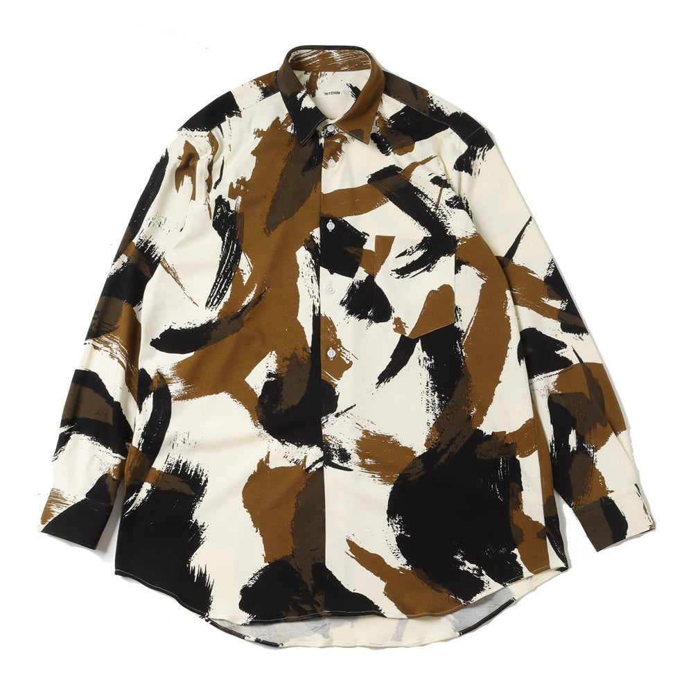 世界のモードを牽引するブランドの仏製シャツレーベルによる1990年代の名作に着想を得たレギュラーカラーシャツ。仏LVMH社のデッドストックコレクションからピックした、ブラッシュドカモのコットンジャージー⽣地を使用。⾝⼱、着丈、アームホールをゆったりととったシルエットに⼩さめの襟を合わせ、タックイン・アウトいずれにもマッチするバランス感に仕上がっております。国内のドレスシャツ専業⼯場で縫製し、細かな運針ながらピリつきのない仕⽴てを実現。前⽴てとカフスには、薄めの⾙ボタンを採⽤しています。