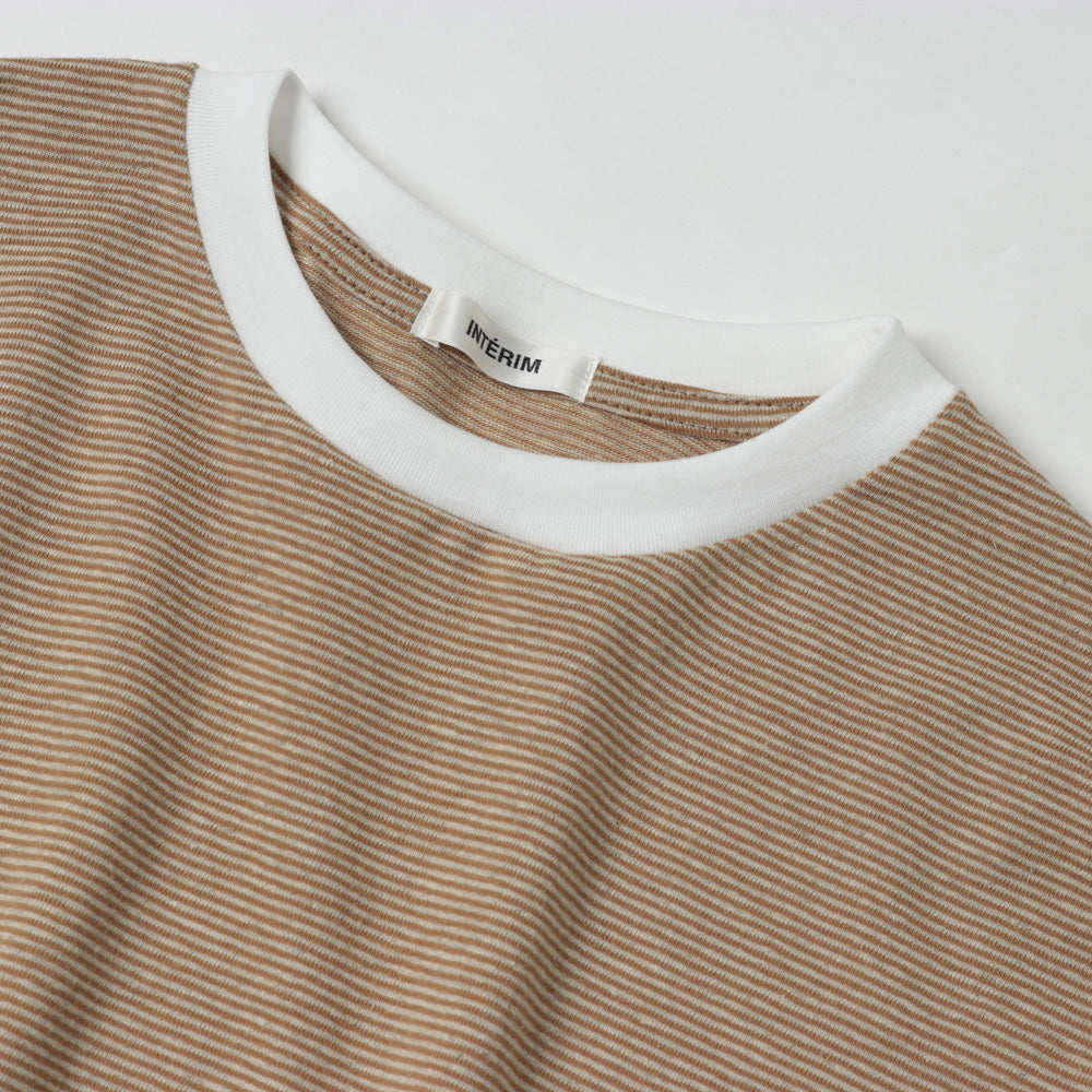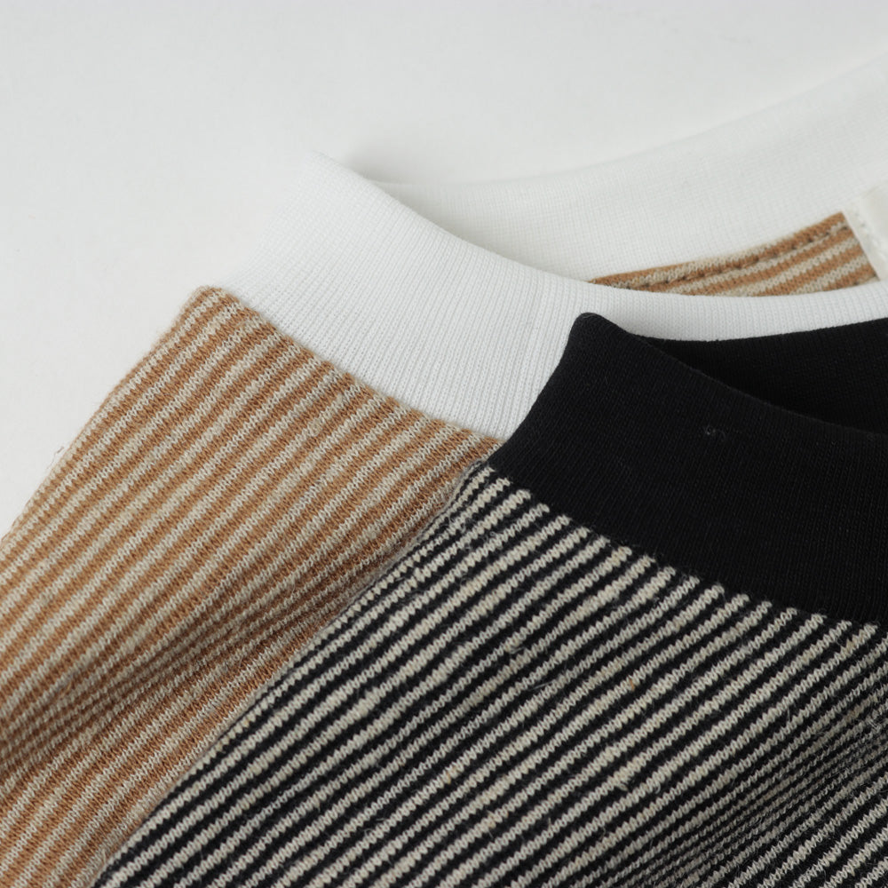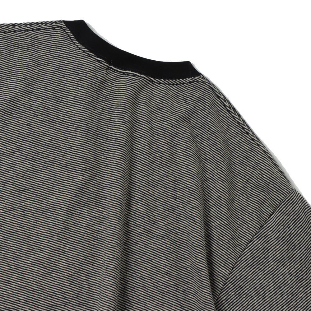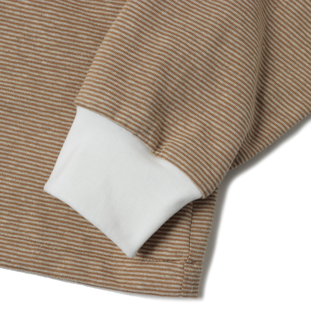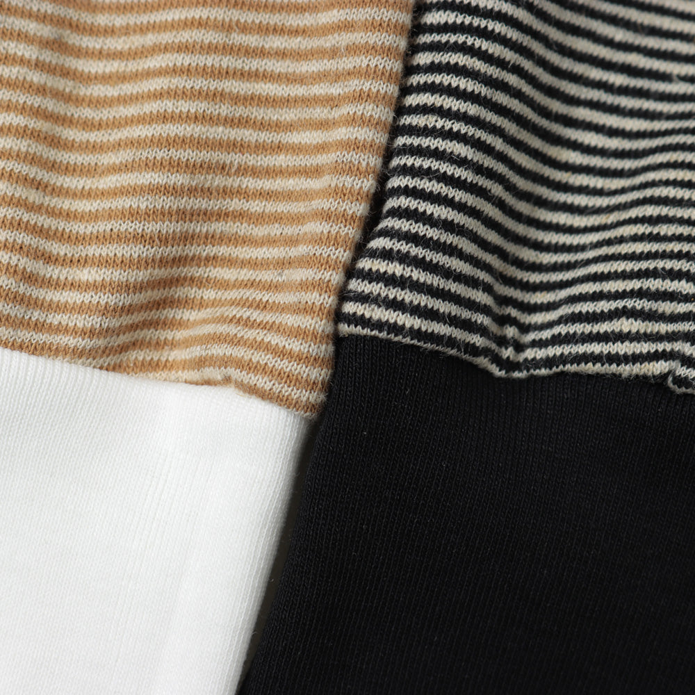 コットンとヘンプを掛け合わせた極めて細いピッチのボーダー生地を採用しました。ところどころにネップや毛羽感のある、自然なヘンプならではの粗野さを楽しんでいただきたい生地です。