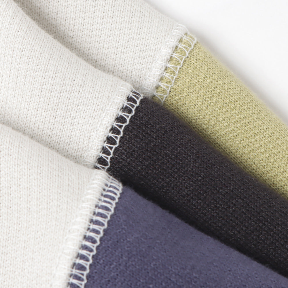 スビンコットンの落ちワタとオーガニックコットンを使用したインレイ編みの生地。 落ちワタとはいえ、超長綿スビンの上質さは健在。落ち着いた光沢がアイテムを格上げして見せます。そして、季節を問わず長いシーズン着用できるよう、生地の厚みは天竺以上、裏毛以下という中肉程度にしました。