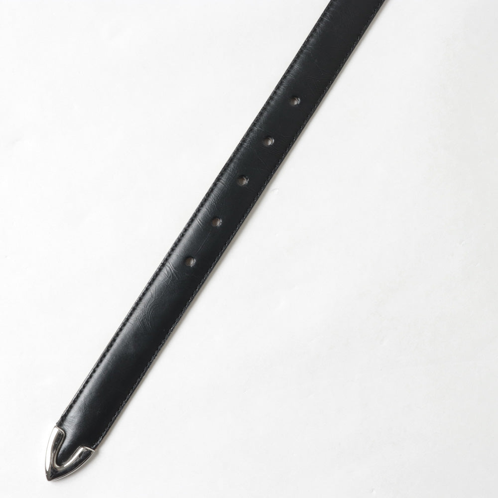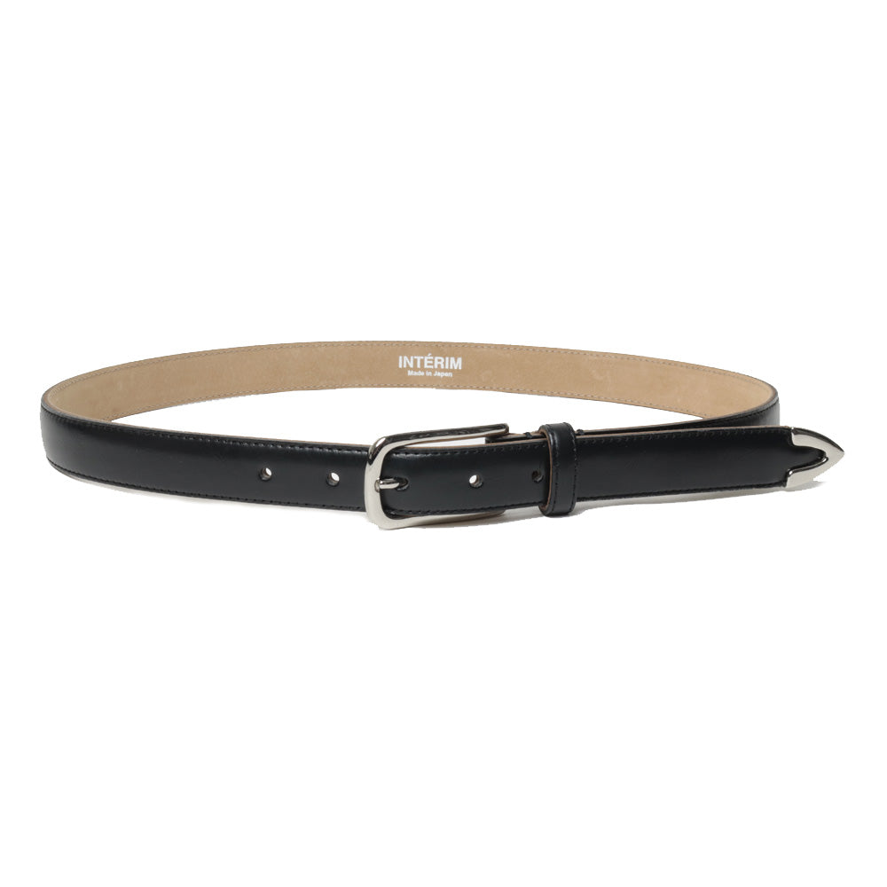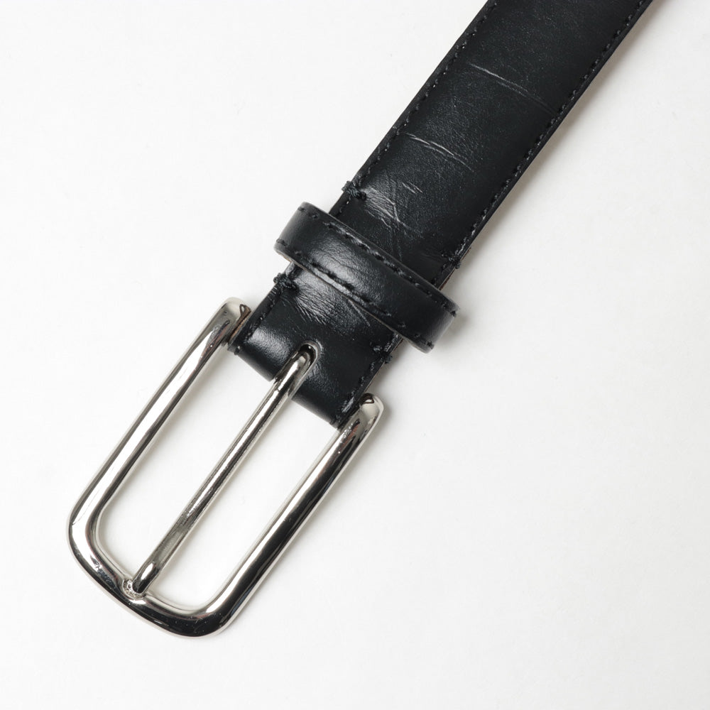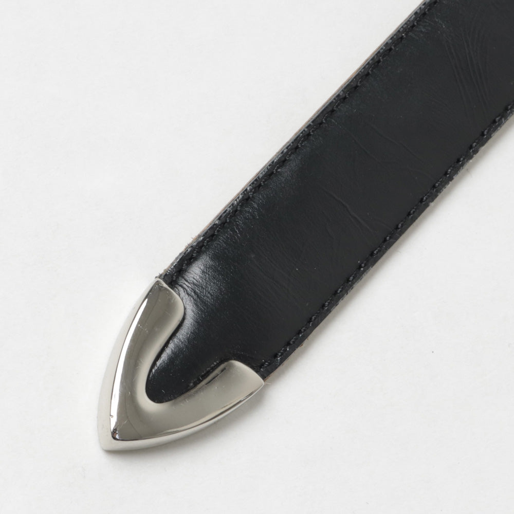 クラシックと現代的なムードを融合させた3層構造のドレスベルト。ウエスタンベルトに⾒られる先⾦と、⻑めのバックルをデザインのアクセントにしています。ベルト中央の膨らみには贅沢に⽜の床⾰を使⽤。⾒えない部分にもこだわった3層構造で形をしっかり保ちながら柔軟性も備え、使い込むほどに独特の美しい⾵合いが増していきます。エッジには職⼈の⼿作業によるステッチを施し耐久性を兼ね備えています。