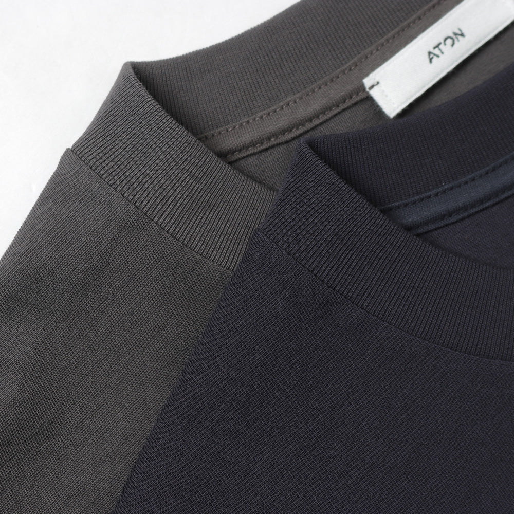 インドの手摘みのスヴィンコットン※を、和歌山市のニッターさんにて編まれた素材です。紡績の段階で特別な工程を入れる事で、強撚糸なのに大変美しい発色を可能にした糸を二本に引き揃えて編む事により、コットン100%とは思えないシャリ感と、肉厚なのに洗濯後も乾きやすく、糸が縮んだ時による細かな凹凸が、肌との接地面が少なくサラッとした着心地の、エイトンオリジナルのジャージ素材です。