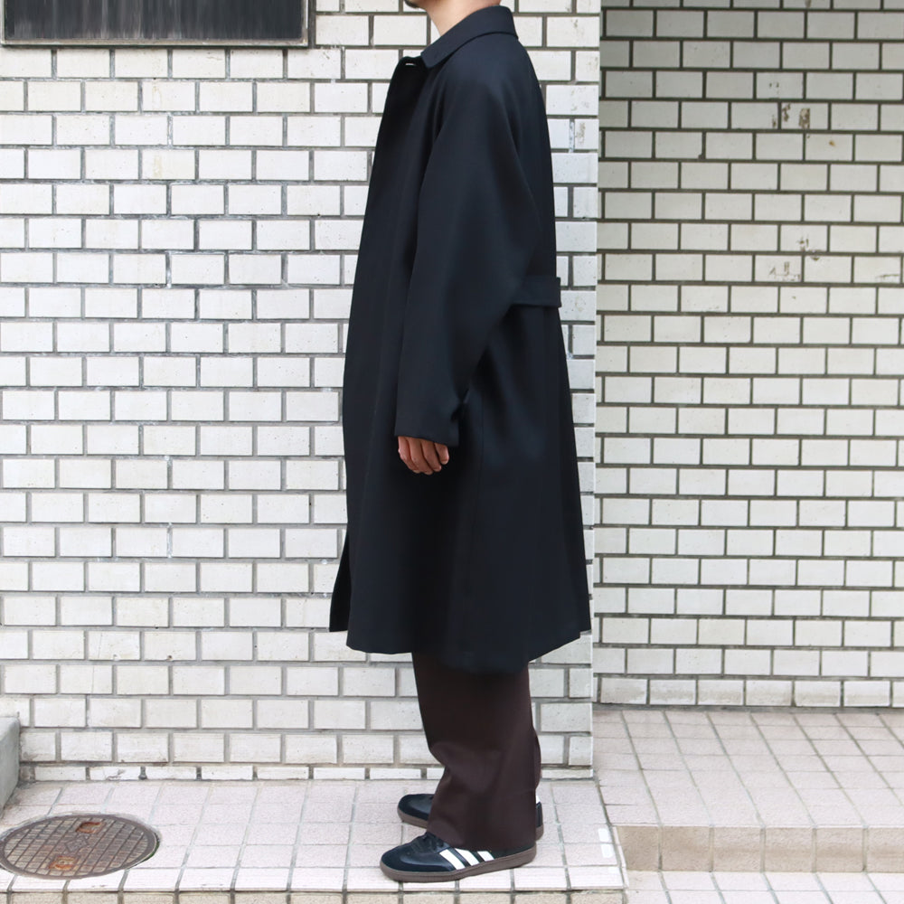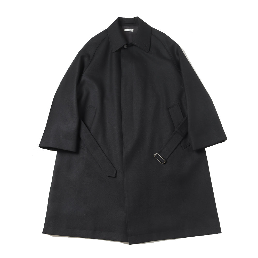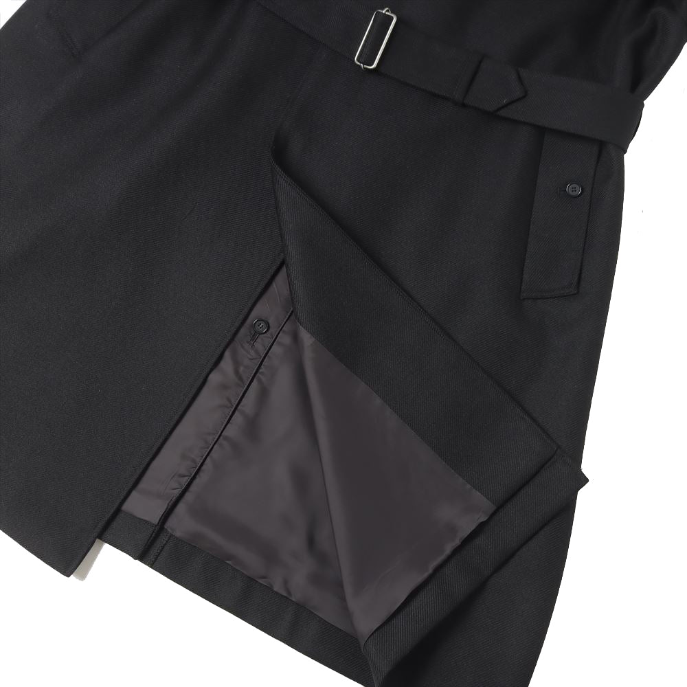 英国のクラシックなオーバーコートをベースにしたベルト付きシングルラグランコート。LVMHのデッドストックからピックアップしたイタリア製のダイアゴナル⽣地を使用。オーバーコートとしてジャケットの上からの着⽤を想定し、通常のシングルラグランコートよりゆったりとしたシルエットです。⾝頃裏・袖裏には表地とのバランスに合わせ、摩擦や湿気、静電気を抑えて快適な着⽤感のキュプラを採⽤しボタンには本水牛を使用しています。