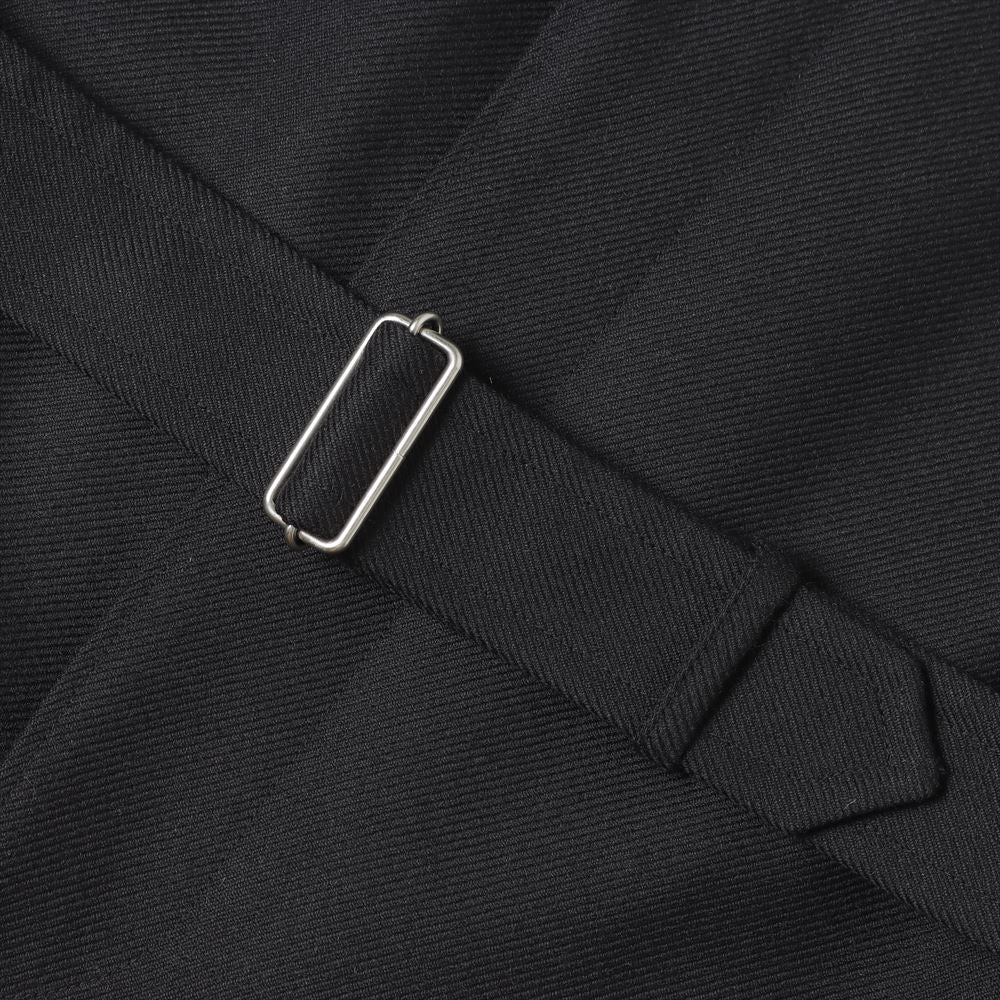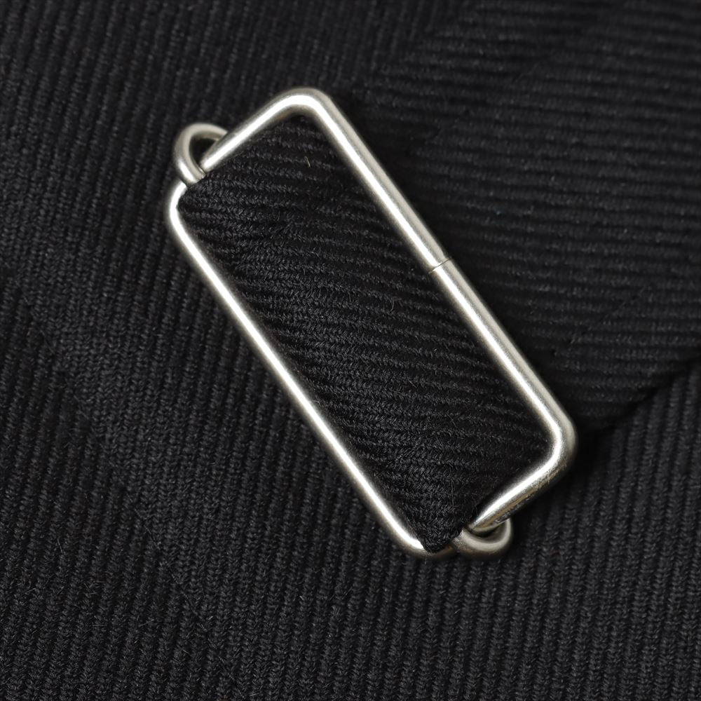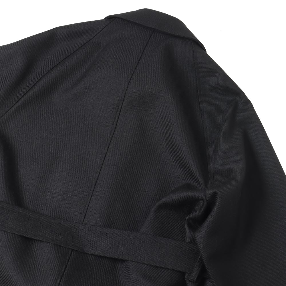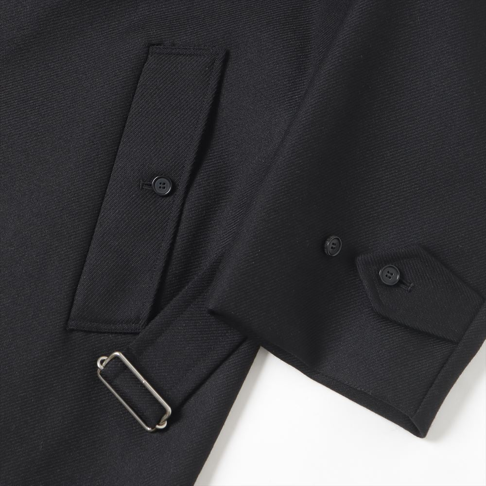 LVMHのデッドストックコレクションからピックアップしたイタリア製のダイアゴナル⽣地。ヘアリー感をほどよく残して⾼密度に織り上げられた、しっかりとした重量感のあるウール100%の⽣地です。がっしりとした表情ながら粗野さはなく、芯までしっかりと染まったブラックの⾊みや⾼級な原料特有の光沢感など、ラグジュアリーな印象も兼ね備えます。裏地にはより軽さがあり、滑りのよいブラックのキュプラ⽣地を採⽤しています。