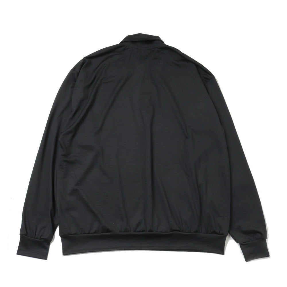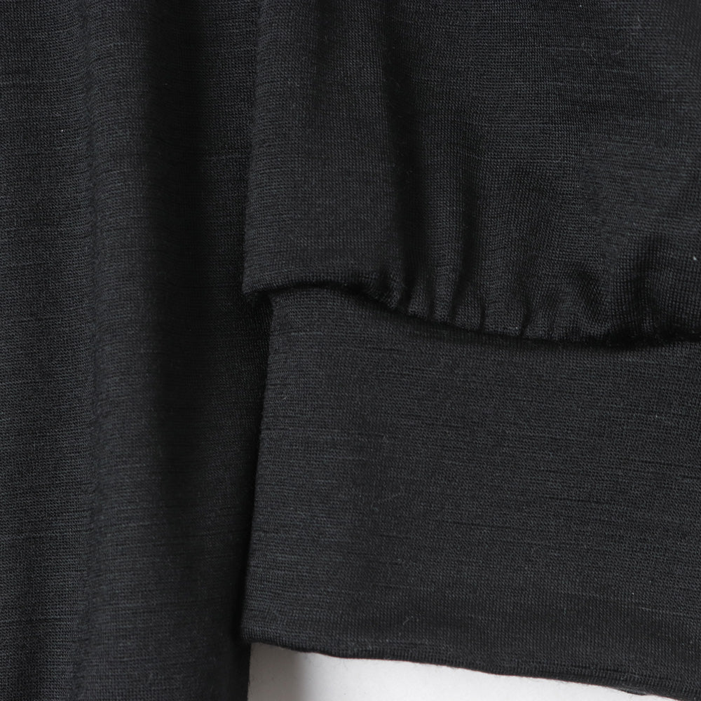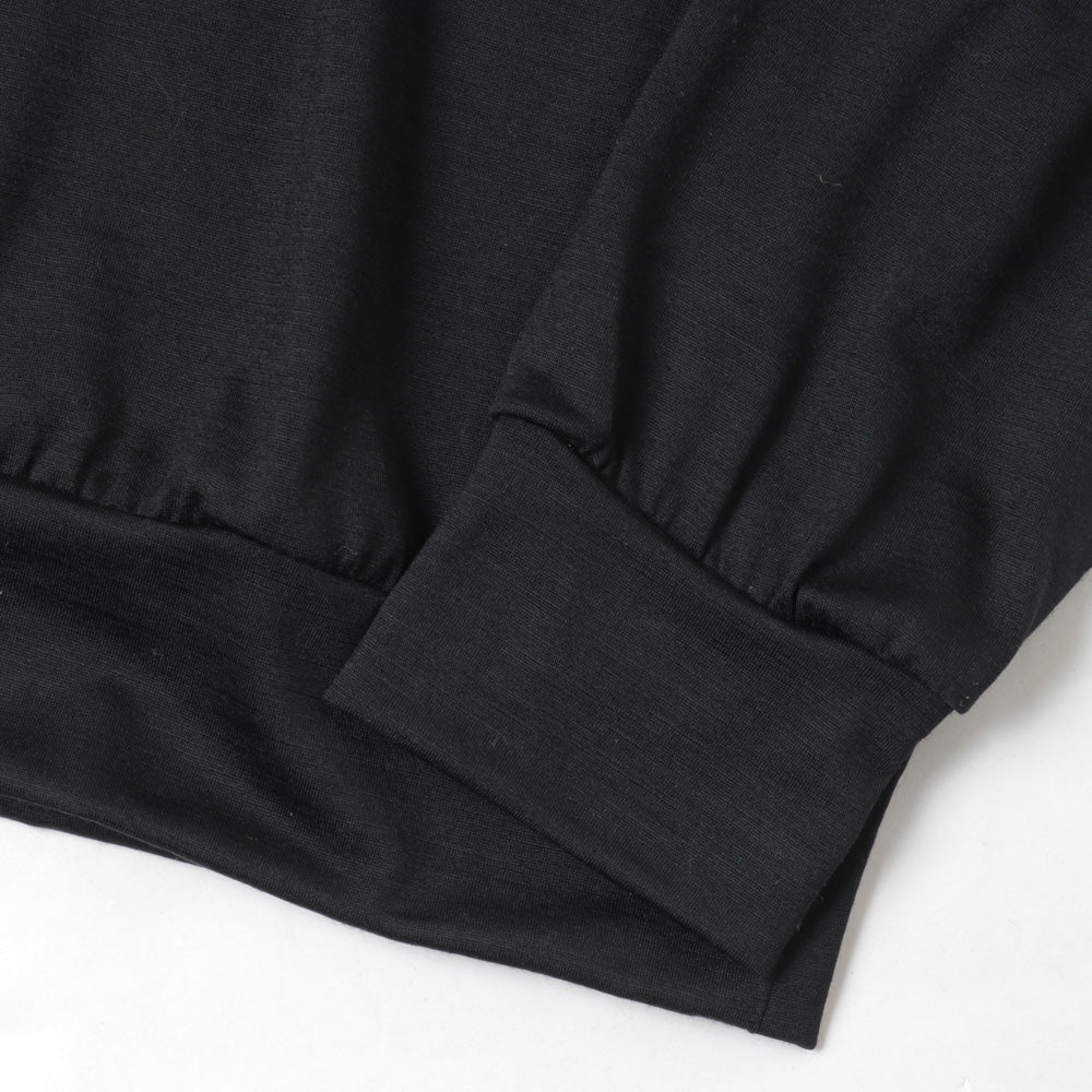 エクストラファインメリノによる48番単糸を使用したオリジナルのウール天竺生地。生機の時点で強い光沢感があるものの、整理加工時にさらに特殊加工を施し光沢感となめらかな表面感、美しい落ち感を表現しています。