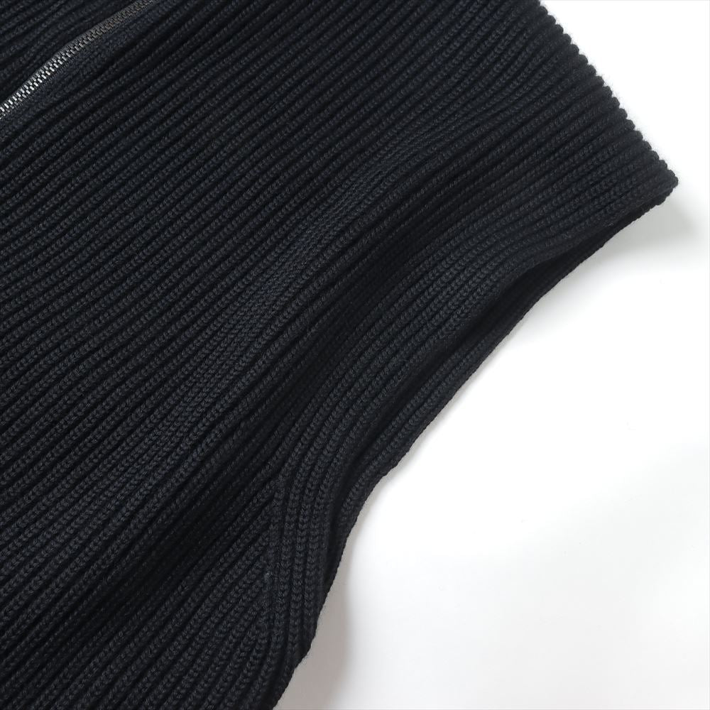 国内では設備・編み⼿ともに希少になりつつあるハンドフレーム(⼿横編み)のドライバーズニットベスト。本来針に掛けることができる限界よりもさらに1本⽷を増やし、極限まで度⽬を詰めて編み⽴てることで、アウターとしても着⽤可能な⾼密度でもっちりとしたボリューム感のある⼀枚に。前⽴てには伊ランポー社のアンティークブラックのジッパーを採⽤しています。ベストタイプは、肩⼱を広く取ることでアウターの上にも着⽤可能なデザインに仕上げています。