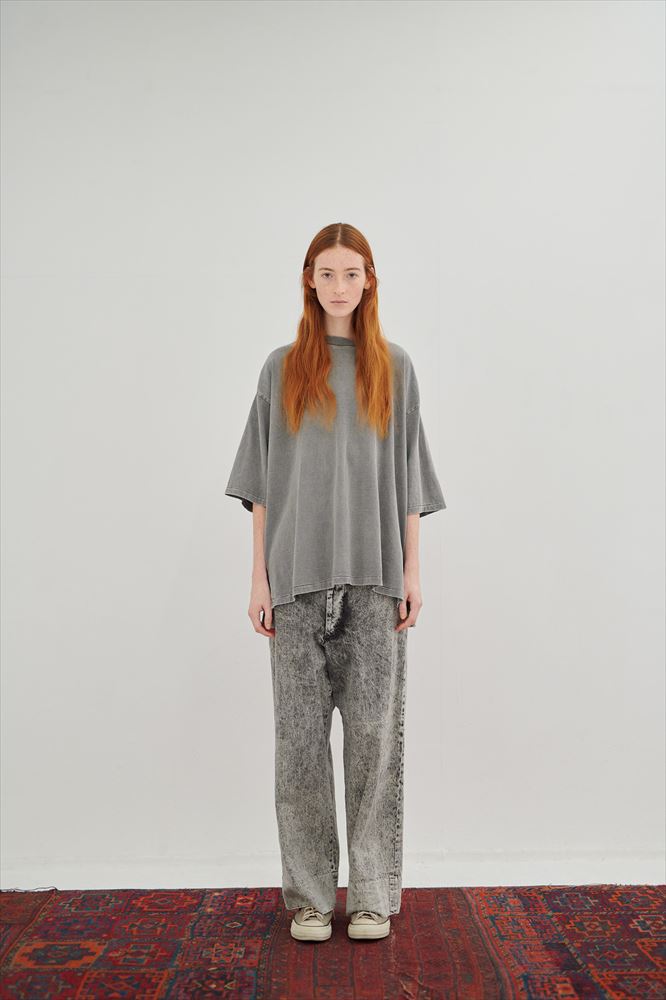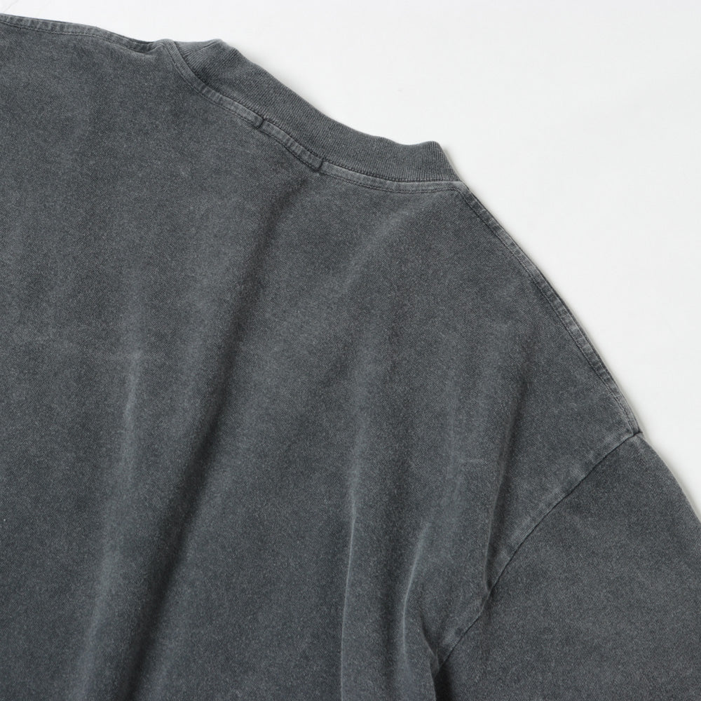 アメリカ製のビッグTシャツをベースにしたフェード加工のTシャツ。身幅はゆったりですが着丈はやや短めに設定。サイドスリットを配し、前後差を付けることで動きのあるシルエットを楽しむことができます。国内のメリヤス専業⼯場で縫製し、裾には熟練の職⼈の⼿を必要とする天地引き、ネック周りは強度の⾼いタコバインダーを採⽤しています。