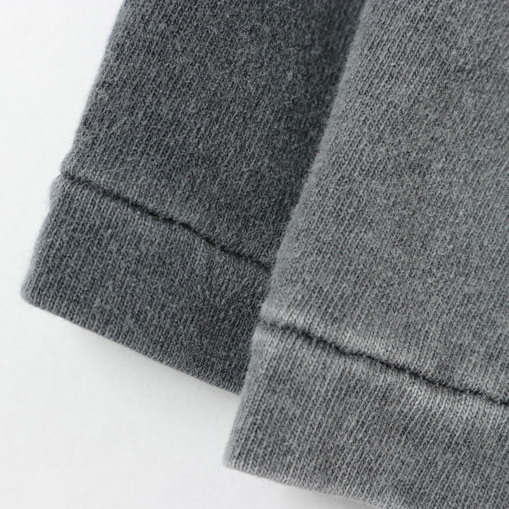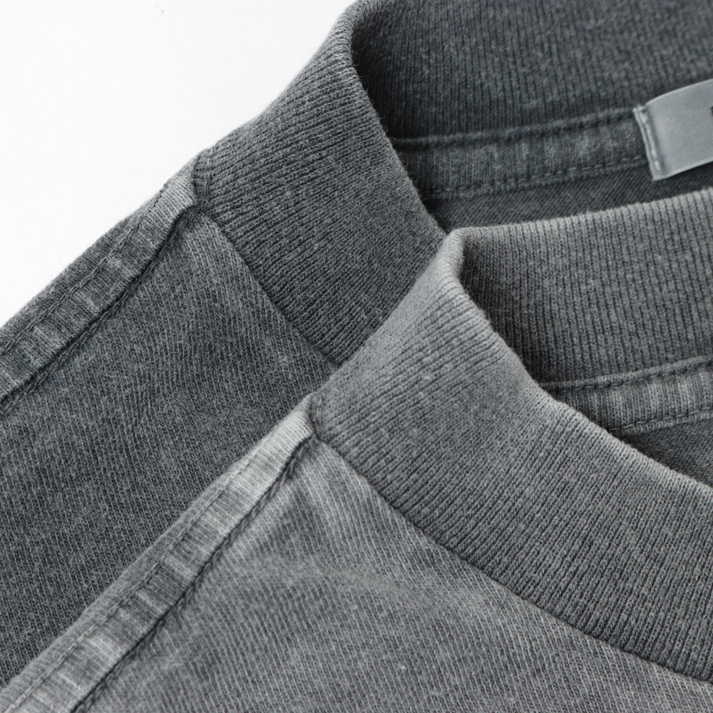 当時のアメリカ製のTシャツに使われていたドライな表情を再現するべく空気を含ませた特注の空紡⽷を使⽤し、シャリ感のある度詰め⽣地に仕上げました。加⼯は⾼度な技術と複雑な計算を必要とし、国内でも限られた⼯場のみが保有する特殊な機材を⽤いて⾏われる⾮常に希少な加⼯です。細かい粉末状の脱⾊剤を使⽤し独特なムラ感が⽣まれる特殊なブリーチ処理で、ミッドブラック・ライトブラックの2⾊を表現しています。⼀枚⼀枚異なる表情をお楽しみいただきたいです。