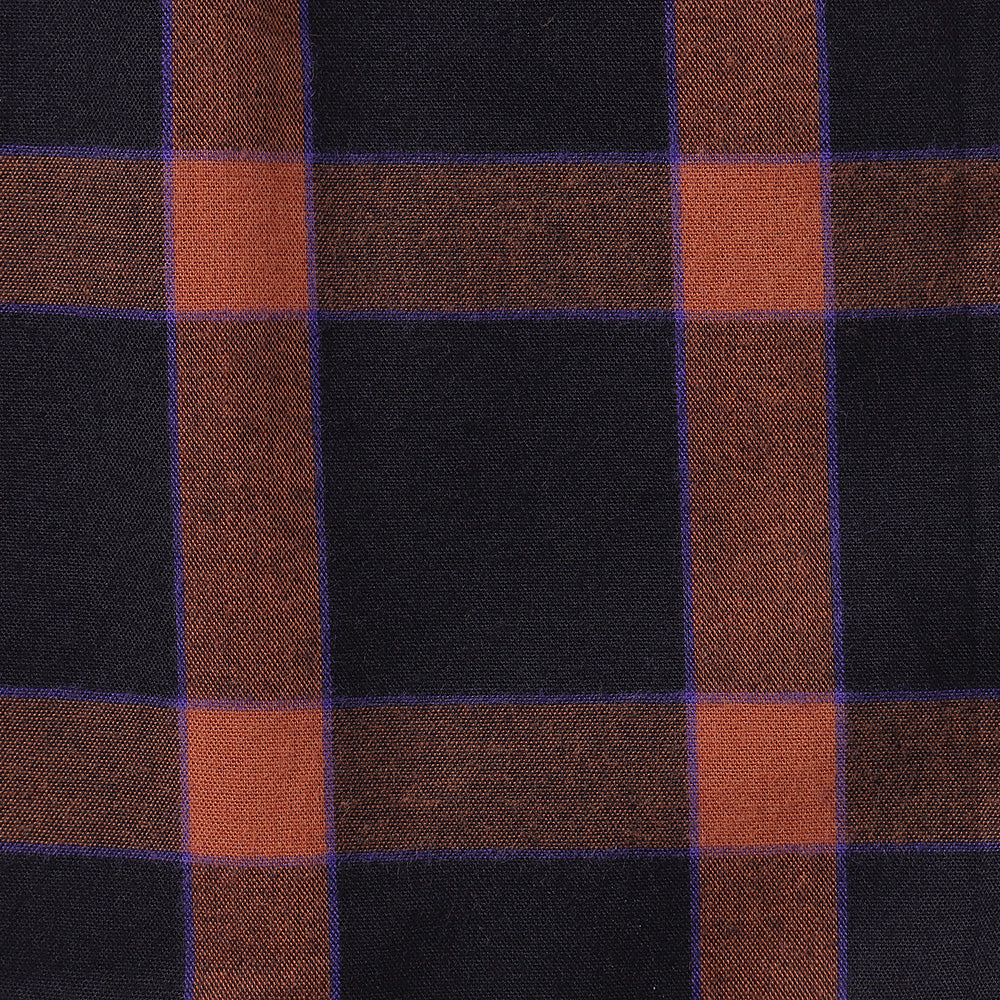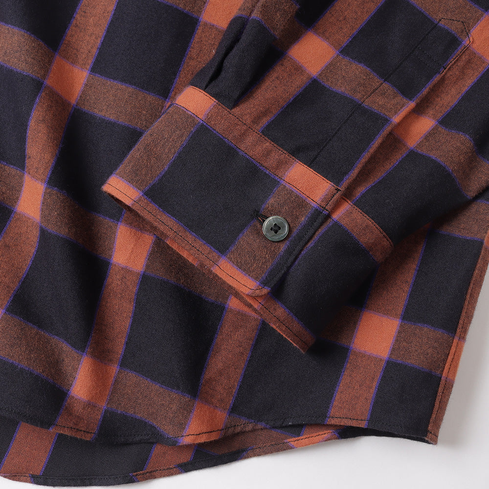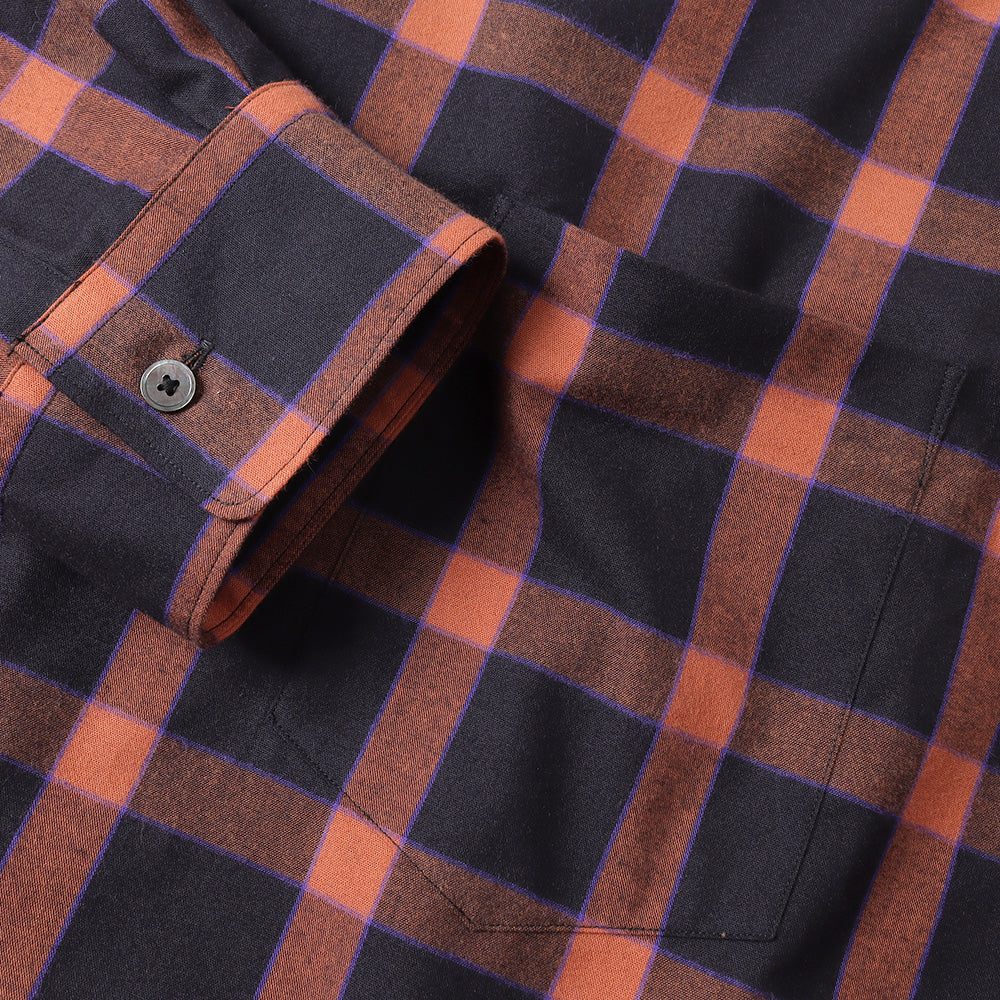 仏LVMH社のデッドストックコレクションからピックした、⽐較的ライトウェイトなイタリア製フランネチェック⽣地。オレンジとブラックをベースに、ブルーのラインを利かせたカラーリングです。