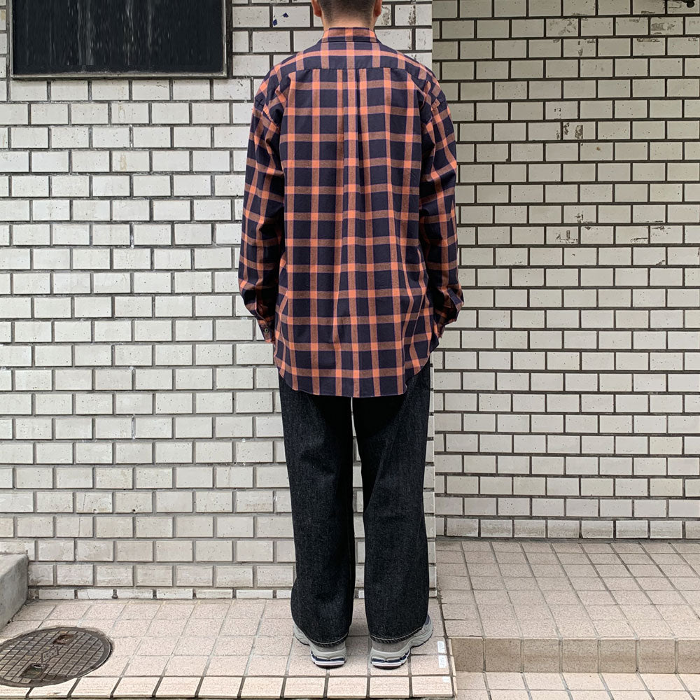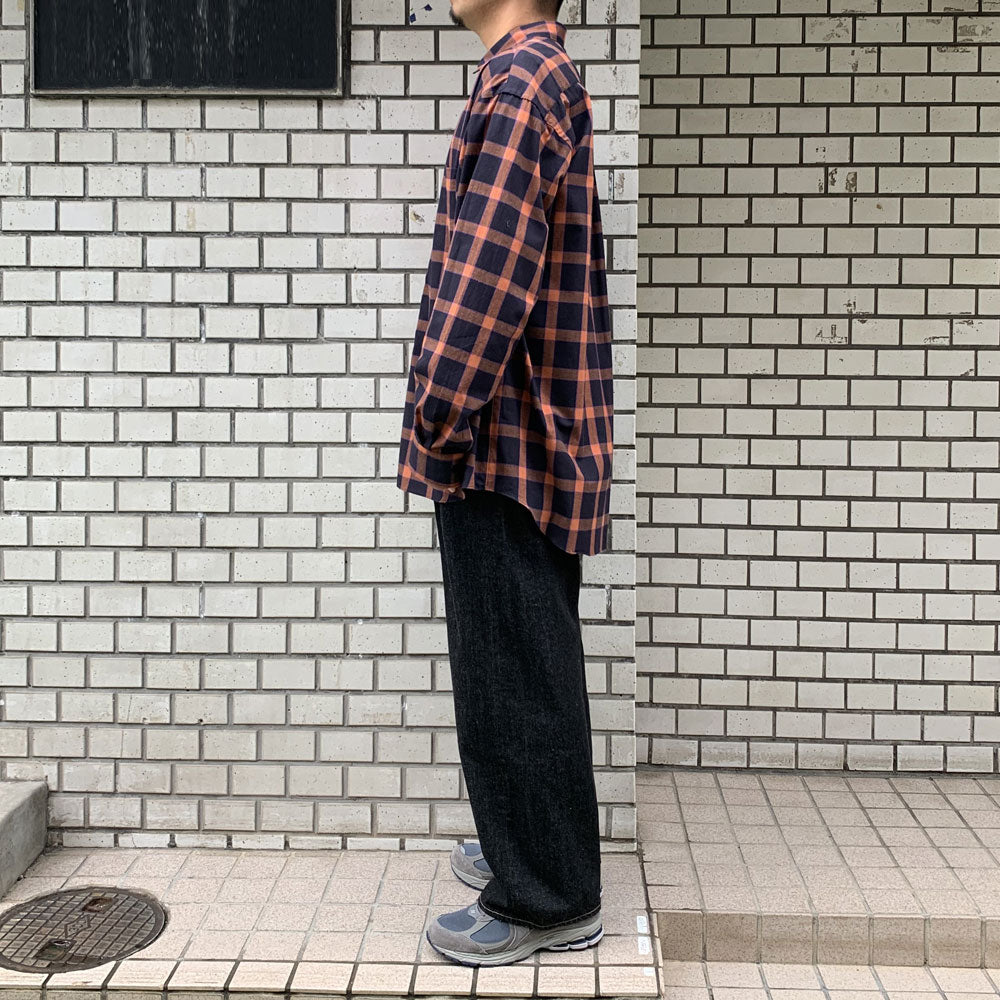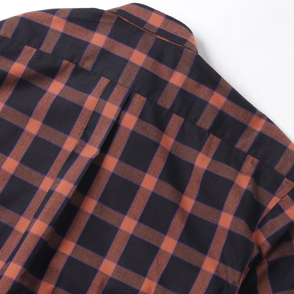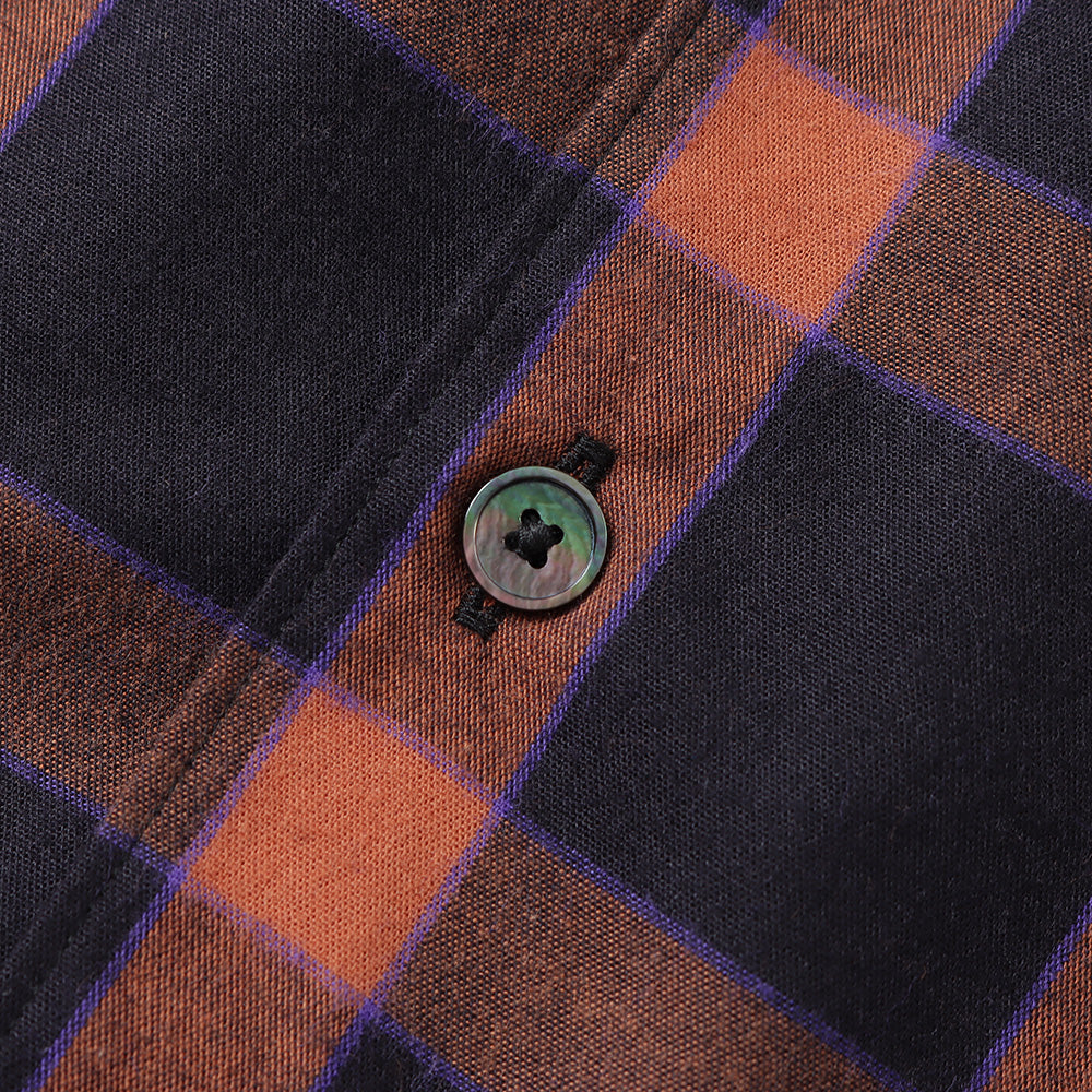 仏LVMH社のデッドストックコレクションからピックした、⽐較的ライトウェイトなイタリア製フランネチェック⽣地。オレンジとブラックをベースに、ブルーのラインを利かせたカラーリングです。
