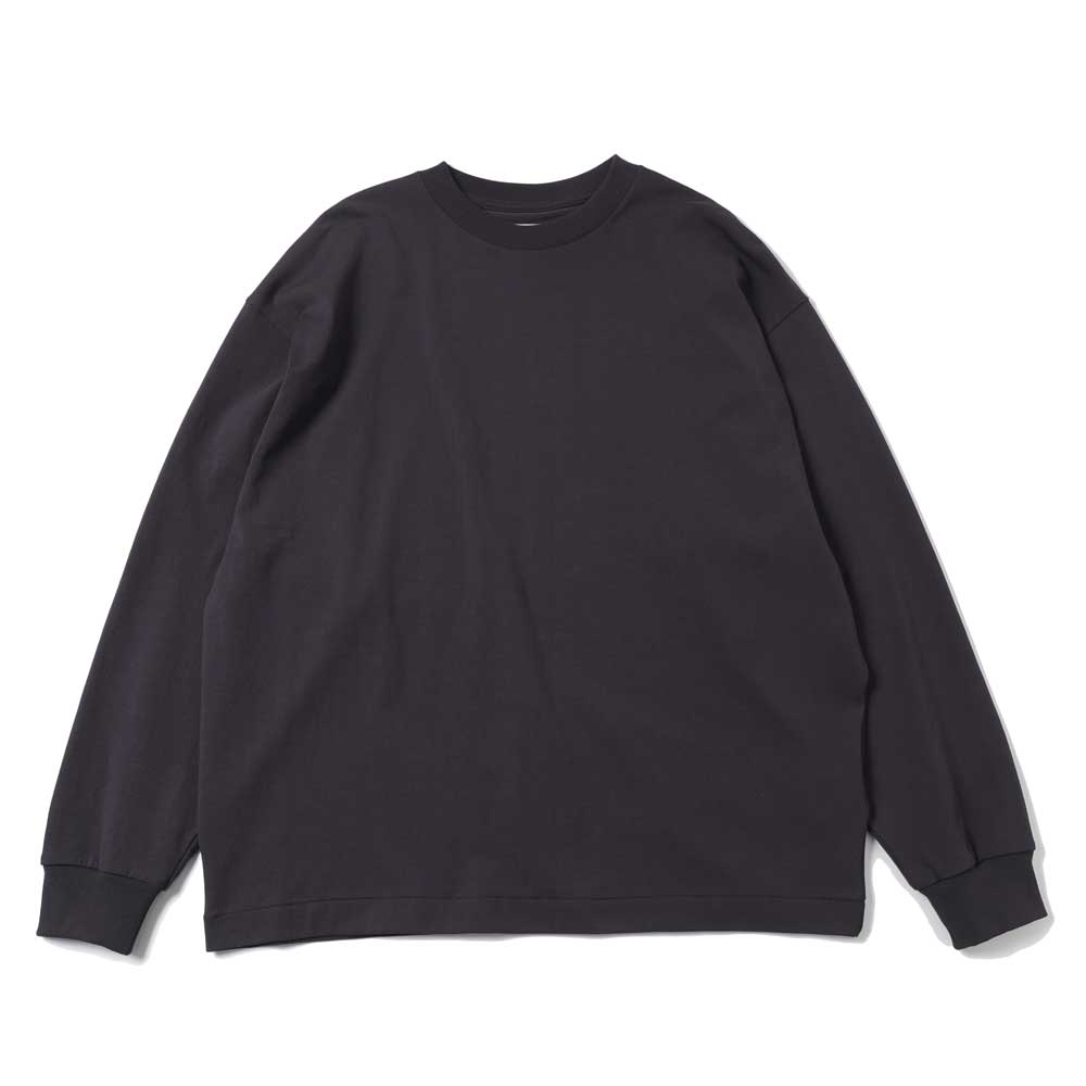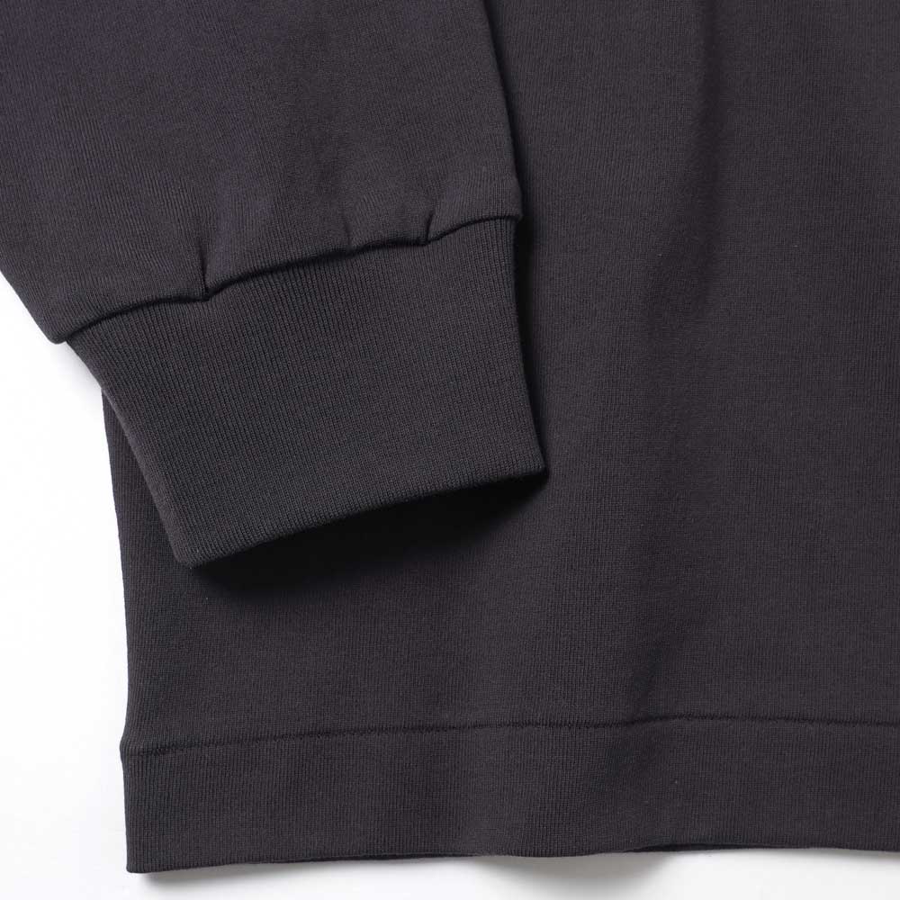 Tapered Oversized Long Sleeveです。 ゆったりとしたオーバーサイズながら、裾に向かってややテーパードした独特のシルエットが特徴です。 裾まわりに余計な布がたまらず、自然と立体的なフォルムを描くよう計算してパターンを設計しています。 大きくとったアームホールから、ブルゾンのように立体的に膨らむ袖が生まれ、着用するとロンTという枠を超え、プルオーバーのような存在感のある佇まいになります。 この立体感は、ドレーピング技術と、張りとドレープ性を兼ね備えたこの素材だからこそ表現できるものです。 一枚で着ても様になり、インナーとしても着られる便利なカットソーです。