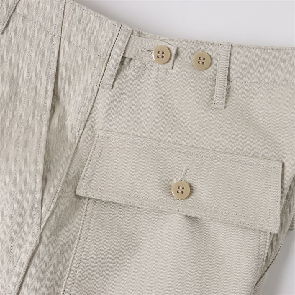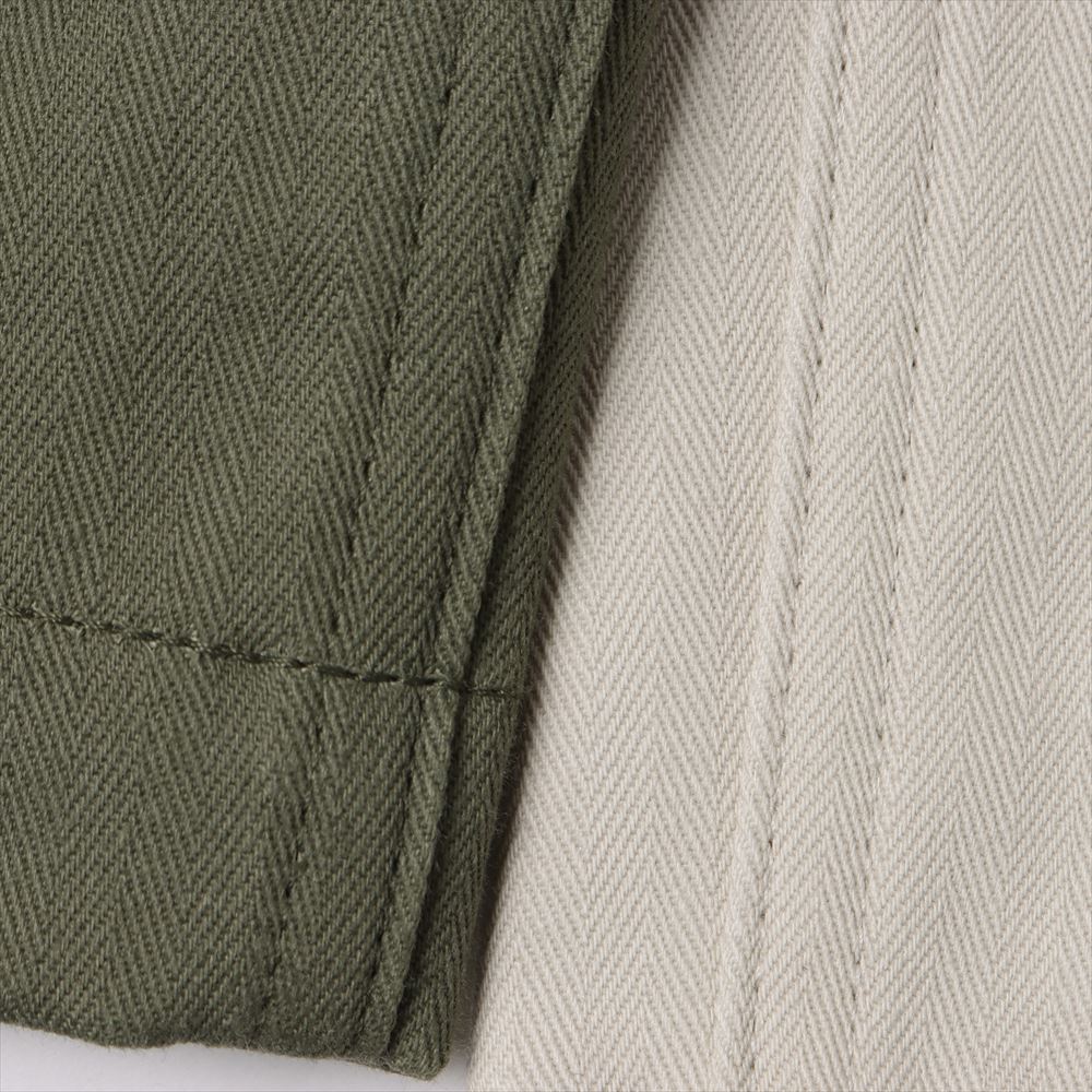 1950年代のUS ARMYのM-47タイプを再現し、オーガニックコットンを100%使用したヘリンボーンツイル生地。農薬や化学肥料を使用せず育てた綿花を使用しており、しっかりとした密度がありながらも柔らかくなめらかな風合いを実現しています。
