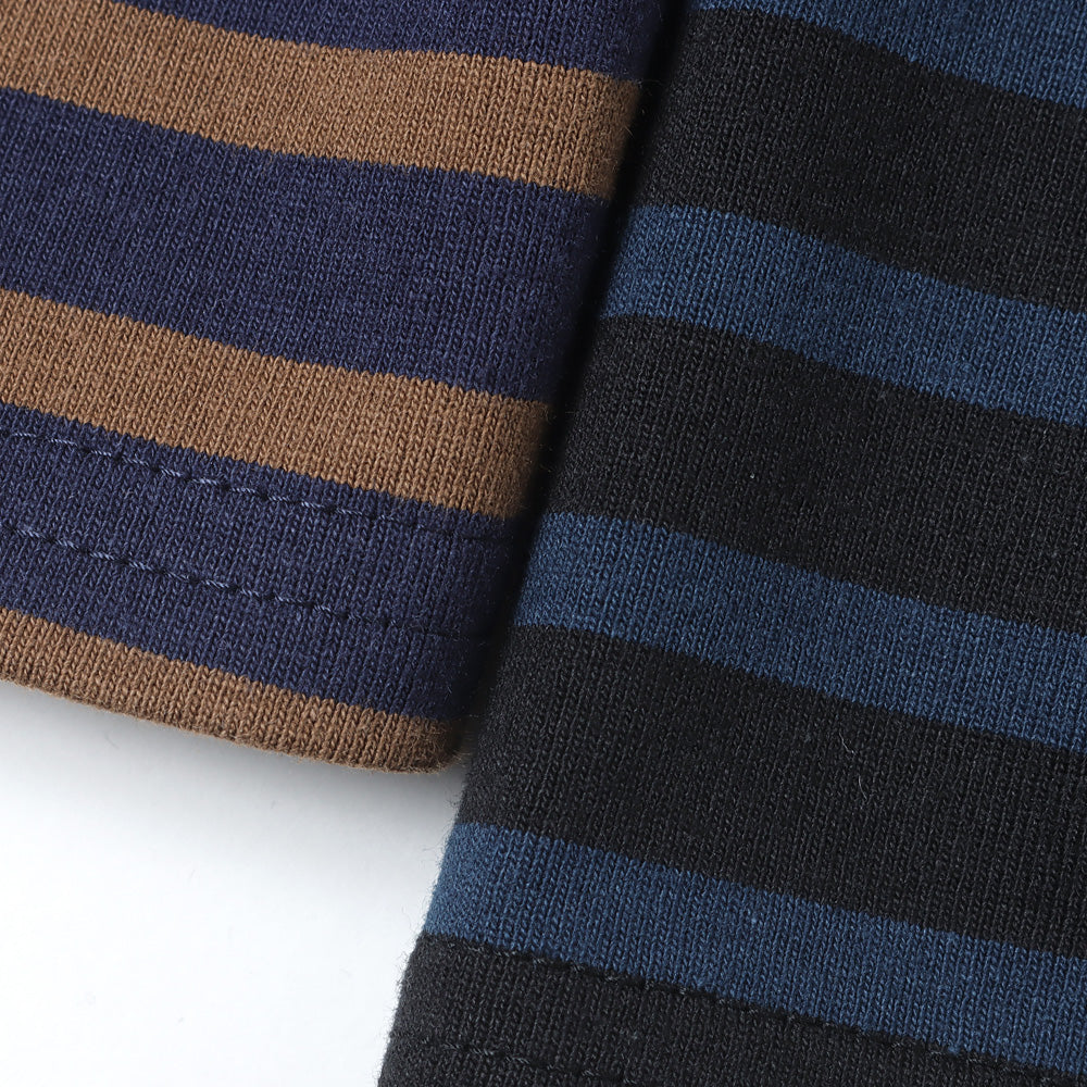 毛羽の少ないBD天竺でシャリっとした生地感が特徴の30番手空紡糸を使用。引き揃えといって細い糸を並べてしっかりさせている為ハリ感のある生地になっています。