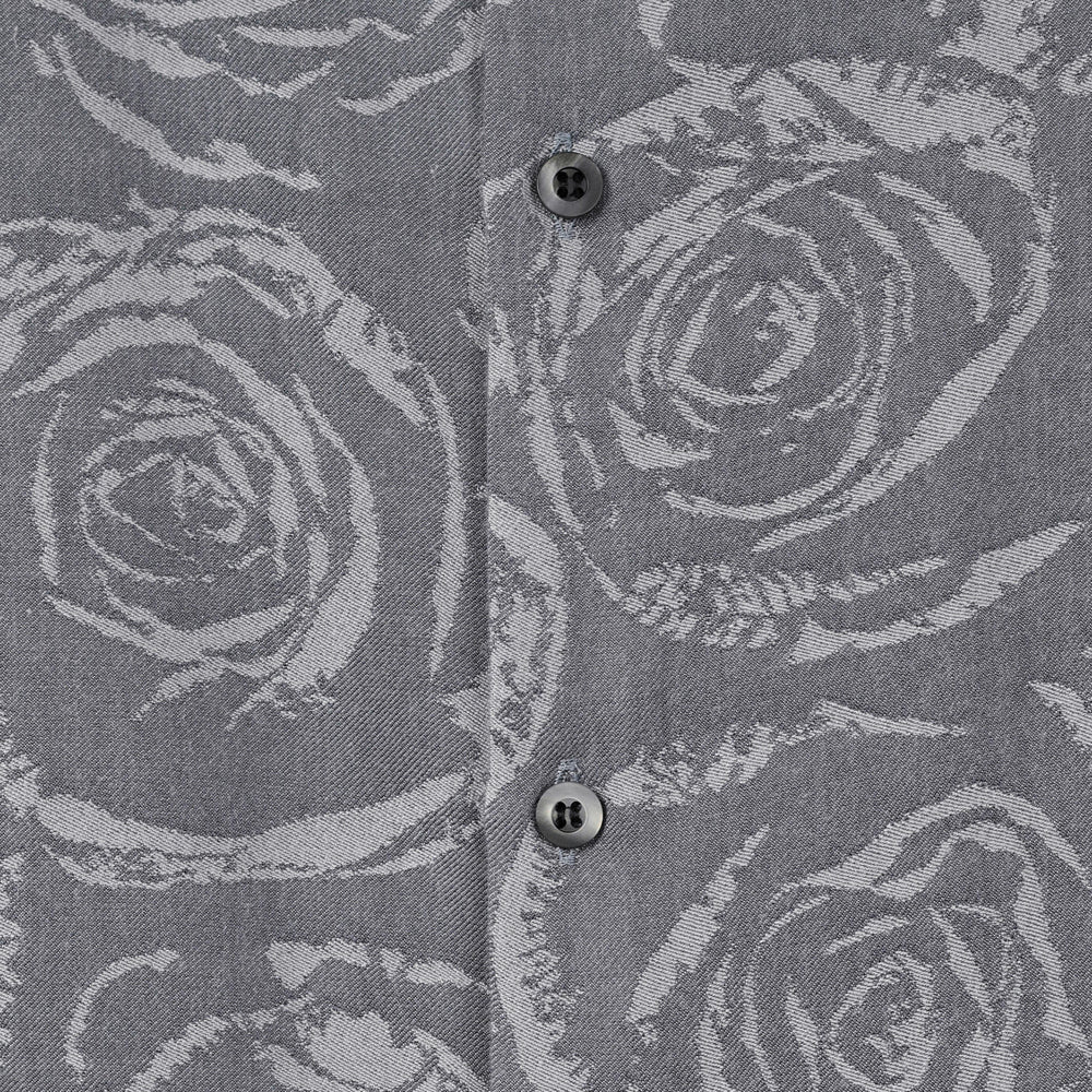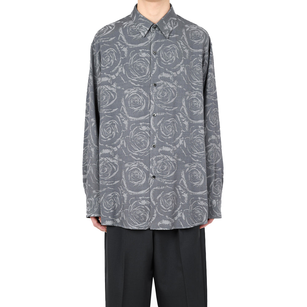 ローズ柄のレーヨン素材を使用した定番ビッグシャツ。ジャカードで繊細にローズ柄を表現した素材を使用。レーヨンの持つ適度なドレープ性と滑らかな肌触りが特徴。程好くゆとりを持たせたラウンドヘムのビッグシルエットです。袖はすっきりとしているので、インナー着用時でももたつきなく袖通りを良くしています。