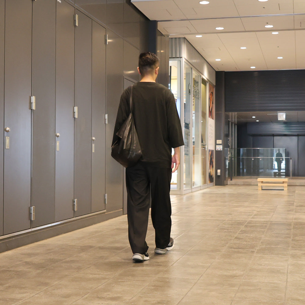 シンセティックレザーを使用した新型フラップバックワンショルダー。斜め掛け・ハンドキャリーを想定した3WAY TYPE。内側には二口のポケットあり。