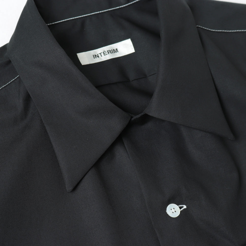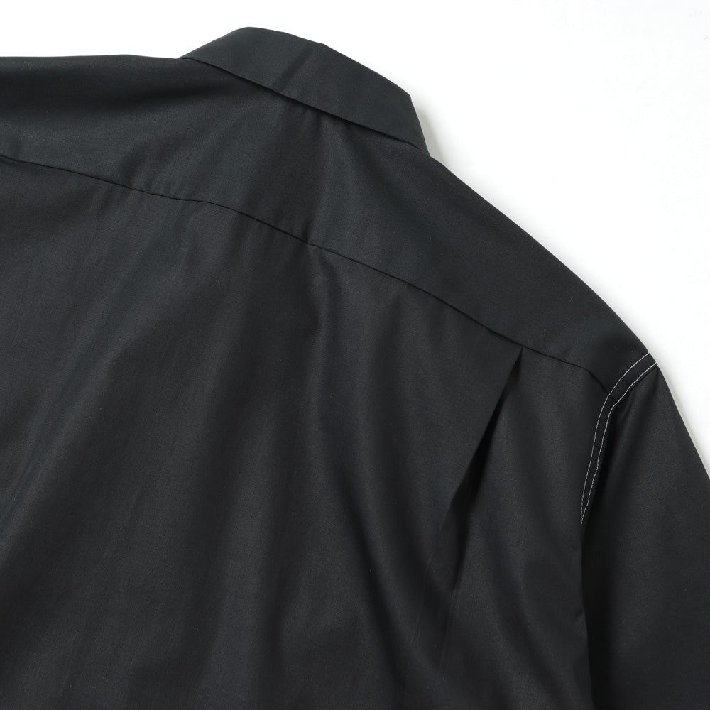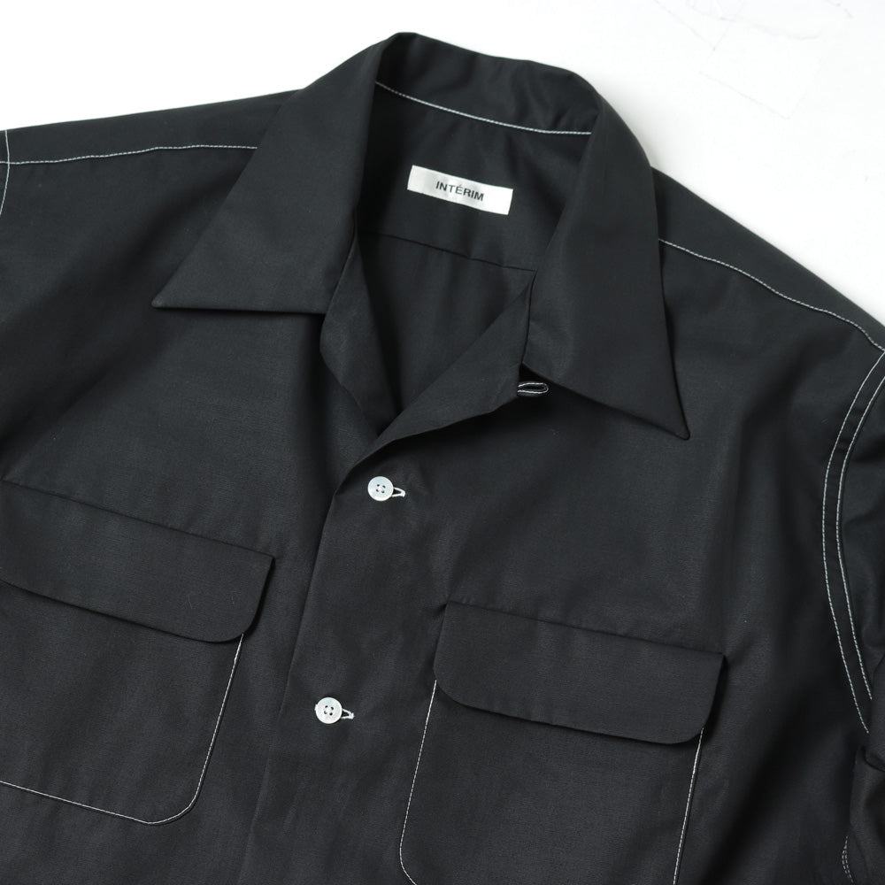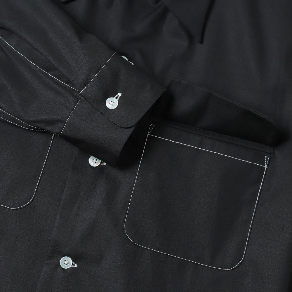 1950年代アメリカのレーヨン開襟シャツを着想源にしたデザイン。当時の雰囲気を再現するため、ややコンパクトなボックスシルエットにしています。前⽴てには⾙ボタンを採⽤し、白いステッチをアクセントにしたシャツです。