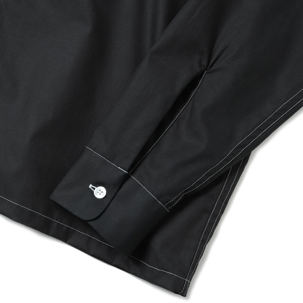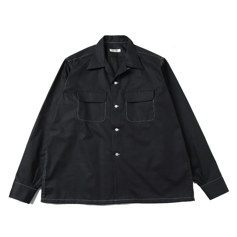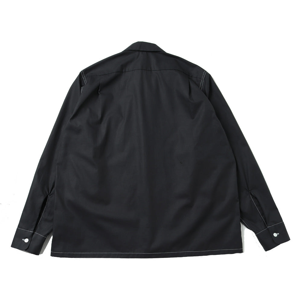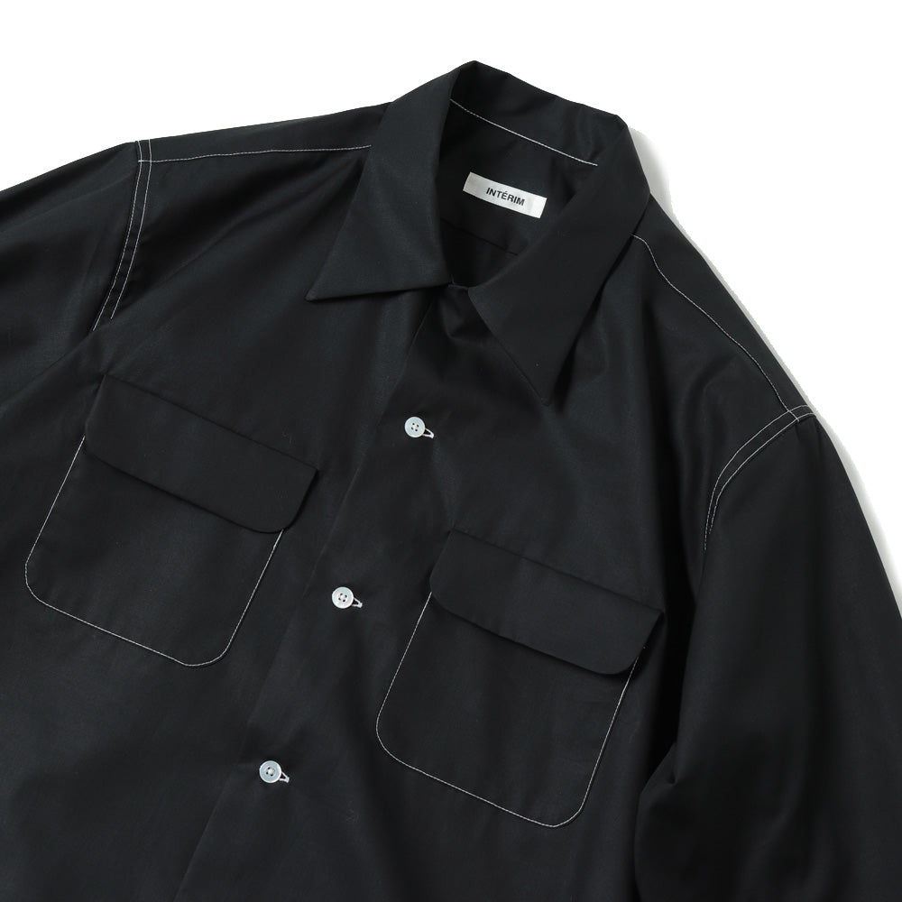1950年代アメリカのレーヨン開襟シャツを着想源にしたデザイン。当時の雰囲気を再現するため、ややコンパクトなボックスシルエットにしています。前⽴てには⾙ボタンを採⽤し、白いステッチをアクセントにしたシャツです。