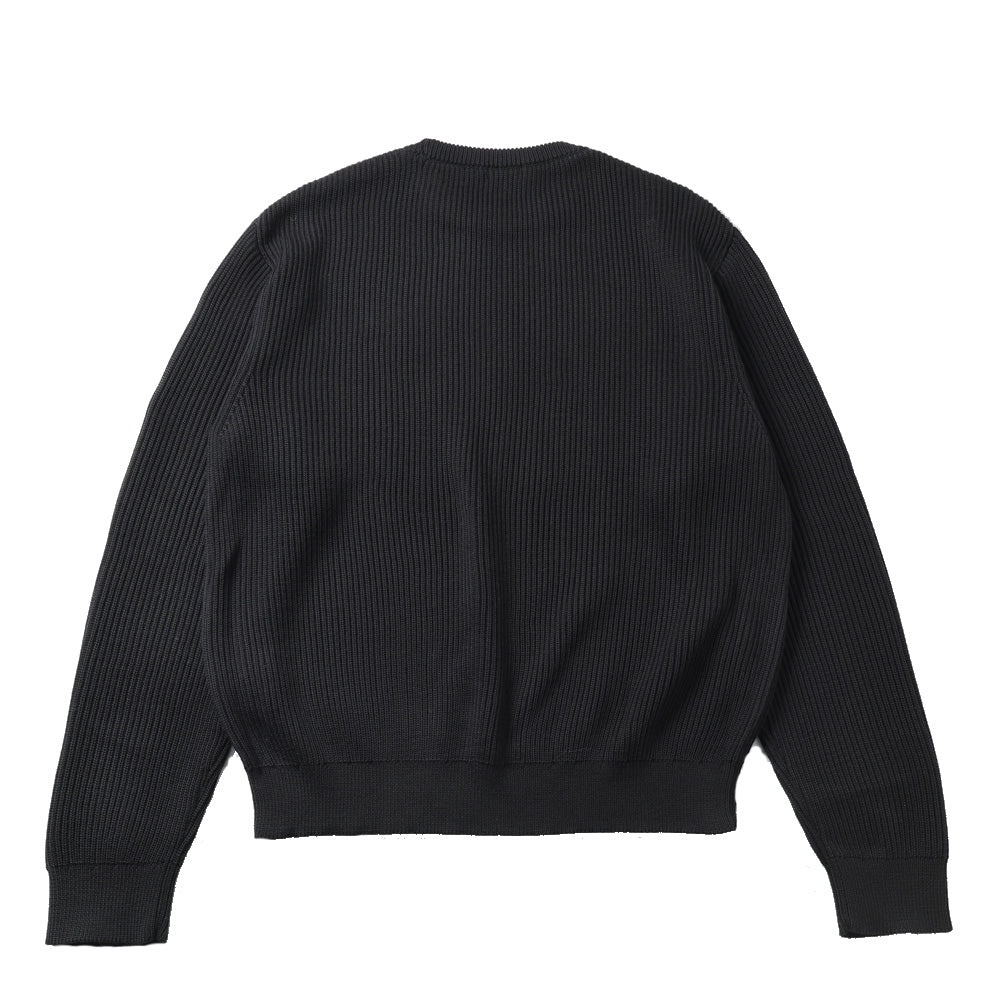 本来スーパーハイゲージニット⽤に使われる極めて細番⼿の⽷を超多本取りして製作。⾮常に難易度が⾼い中、熟練ニッターの⼿によって両畦での成型編みにしています。18世紀から続く英国の⽼舗ニットウエアをモチーフにし、当時のものとしては希少な⼤きめサイズの個体をサンプリングしています。
